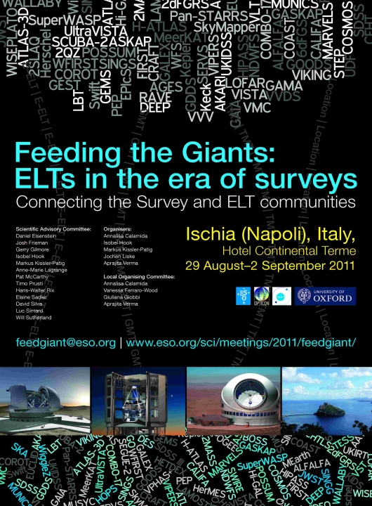 This workshop was aimed at exploring the synergies between the work of existing and forthcoming survey facilities and the Extremely Large Telescopes (ELTs), i.e. the E-ELT, the GMT and the TMT. It reviewed the projects in these two areas and addressed the developments that these will bring to a wide range of science areas, including exo-planets, star formation, stellar populations, galaxy formation/evolution and cosmology.