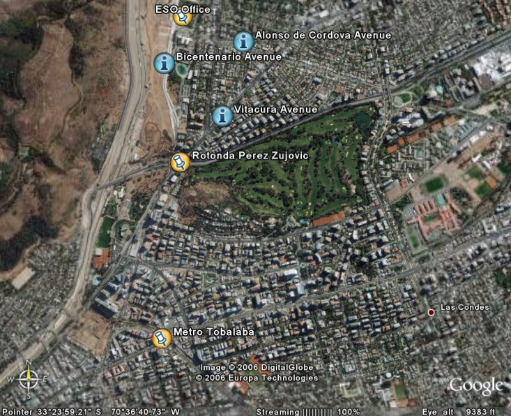 - Metro The closer station from the ESO office in Vitacura (Santiago) is the metro station 'Tobalaba' (Línea 1). Exit the Tobalaba station at Luis Thayer Ojeda street and walk until the bus stop no. 405, go off in Vitacura with Alonso de Cordova avenue and walk until the ESO office.