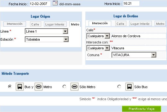 You will get a page where you will be able to write your starting point, in this case Metro Tobalaba and your Destination point (Alonso de Cordova intersects with Vitacura).Click on 'Planifica tu viaje' and you will get several options.