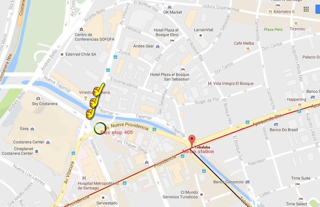- Metro The closer station from the ESO office in Vitacura (Santiago) is the metro station 'Tobalaba' (Línea 1). Exit the Tobalaba station at Luis Thayer Ojeda street and walk until the bus stop no. 405, go off in Vitacura with Alonso de Cordova avenue and walk until the ESO office.