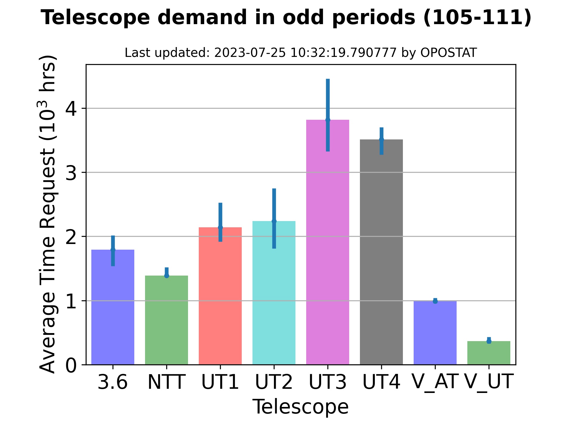 Figure 1: Average telescope time request over the past four relevant semesters (odd or even, depending on the current period). The vertical errorbars indicate the peak-to-peak ranges for each telescope. Units on the y-axis are thousands of hours. The large variation seen in UT2 and UT3 is mostly related to the move of X-Shooter from UT2 to UT3 in P105. The times included in the plot correspond to the runs requested in the given semester by proposals submitted in the same semester.