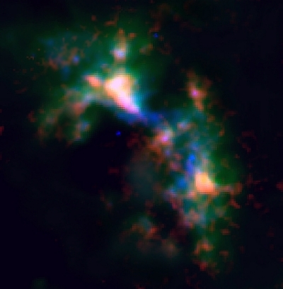 In green, the Herschel Space Observatory PACS 100 μm image (part of the HERITAGE consortium) helps locate the warm dust;
