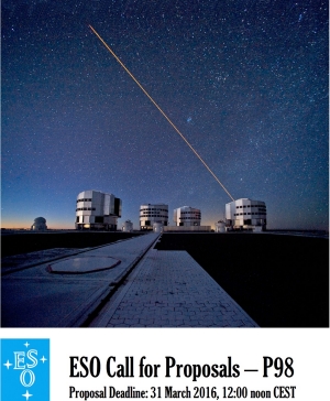 The Call for Proposals for observations at ESO telescopes in Period 98 (1 October 2016 - 31 March 2017) has been released. Please consult the Call for Proposals document PDF for the main news items and policies related to applying for time on ESO telescopes. All technical information about the offered instruments and facilities is contained on ESO webpages that are linked from the Call.