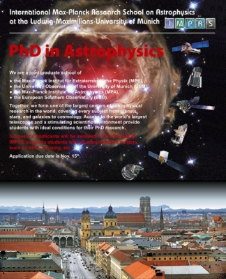 The International Max-Planck Research School on Astrophysics is a joint graduate school of the Max-Planck Institutes for extraterrestrial Physics (MPE) and Astrophysics (MPA), the Observatory of the Ludwig-Maximilians University (LMU), and ESO. It has its centre on the Garching research campus and offers a number of full 3-year positions to conduct exciting research in one of the involved institutes.