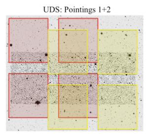 Upper image: Example of VIMOS pointings within the UDS field from the ESO Phase 3 data release description.