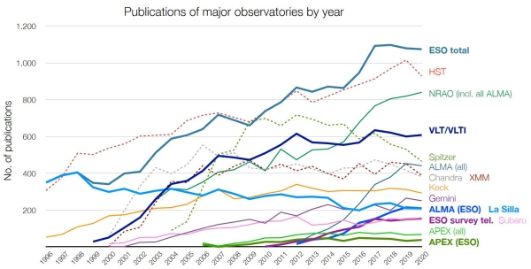 Comparing publication statistics for ESO and other observatories is complicated by the fact that different institutes use different methods to count scientific studies; nonetheless, ESO has remained the world’s most productive ground-based observatory in 2020, with over 1000 papers published using ESO data. The figures are published in the annual Basic ESO Publication Statistics published by ESO’s Library and Information Centre and calculated using the ESO Telescope Bibliography (telbib), a database containing refereed publications that use ESO data. ESO makes extensive efforts to identify all refereed papers that use ESO data and considers telbib essentially complete.
