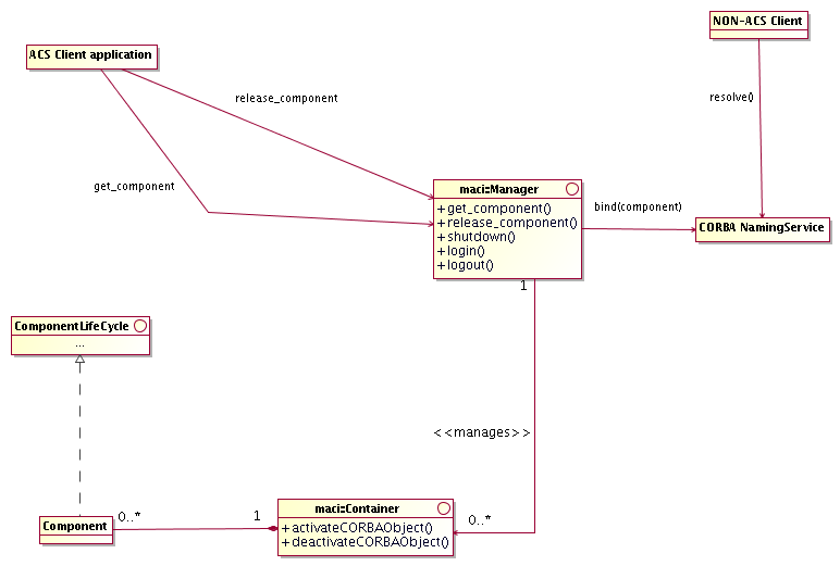 It is the communication entry point. A client requesting a Component service can do so by querying the Manager. Security is tied to this functionality by requiring every client to pass the authorization protocol and subsequently tag every request to the manager with a security token generated by the manager upon successful authentication. Manager serves also as a broker for objects that were activated outside of MACI (non-Components). It provides a mechanism for binding and resolving references to such objects, relying on the CORBA naming service.