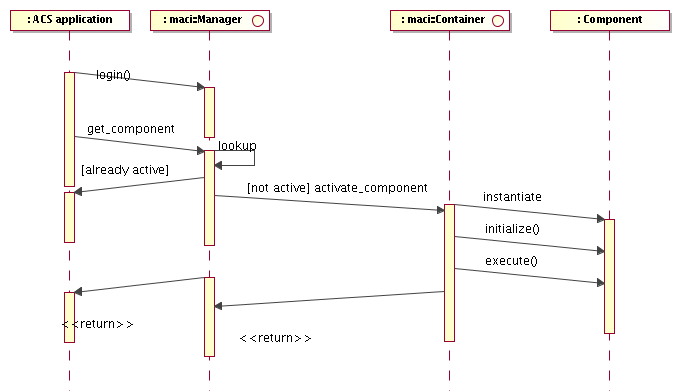 It is the communication entry point. A client requesting a Component service can do so by querying the Manager. Security is tied to this functionality by requiring every client to pass the authorization protocol and subsequently tag every request to the manager with a security token generated by the manager upon successful authentication. Manager serves also as a broker for objects that were activated outside of MACI (non-Components). It provides a mechanism for binding and resolving references to such objects, relying on the CORBA naming service.