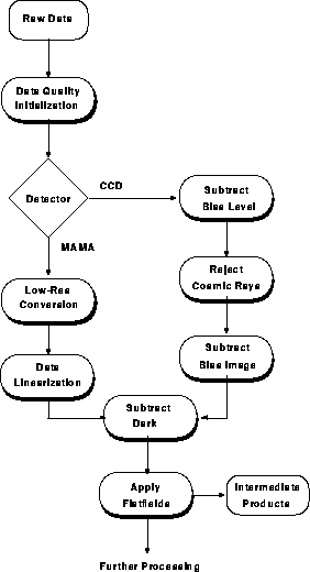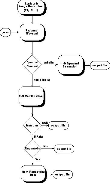Below we present a series of flow charts which provide a more complete overview of the processing of data through the calstis pipeline, starting with the fundamental step of two-dimensional image reduction.