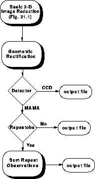 The first step is to reduce the data through flatfielding and reject cosmic rays or co-add the data as appropriate. Figure 21.1 shows the route taken by CCD and MAMA data.