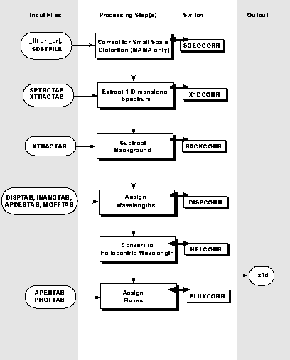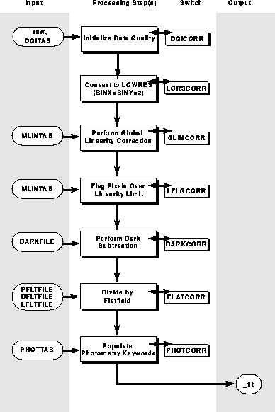 This section details the data flow through the calstis pipeline for each calibrated operating mode, showing the switches, the reference file inputs, the science file inputs and the output products. The next section describes the tasks corresponding to the various calibration switches.