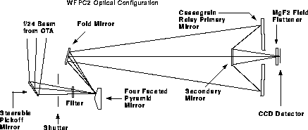 The WFPC2 field of view is located at the center of the HST focal plane; Figure 24.1 shows a schematic of its optical arrangement. The central portion of the f/24 beam coming from the OTA is intercepted by a steerable pick-off mirror attached to the WFPC2 and is diverted through an open port entry into the WFPC2. The beam then passes through a shutter and interposable filters. A total of 48 spectral elements and polarizers are contained in an assembly of 12 filter wheels. The light then falls onto a shallow-angle, four-faceted pyramid located at the aberrated OTA focus. Each face of the pyramid is a concave spherical surface. The pyramid divides the OTA image of the sky into four parts. After leaving the pyramid, each quarter of the full field of view is relayed by an optical flat to a Cassegrain relay that forms a second field image on a charge-coupled device (CCD) of 800 x 800 pixels. Each of these four detectors is housed in a cell sealed by a MgF2 window. This window is figured to serve as a field flattener.