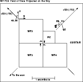 Figure 24.2 shows the field of view of WFPC2 projected on the sky. The readout direction is marked with arrows near the start of the first row in each CCD. The x,y coordinate directions are for POS-TARG commands. The position angle of V3 on the sky varies with pointing direction and observation epoch and is given in the calibrated science header by the keyword PA_V3.