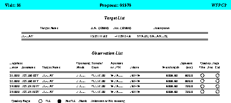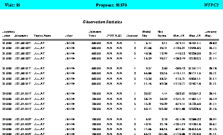 The current paper product package consists of two parts. The first is a visit-level overview of the datasets in the package, meant to be similar to the observing log in ground-based observations. The information is presented in three separate tables: Target List, Observation List, and Observation Statistics. The Target List gives the targets observed in this visit, with their positions. The Observation List includes essential information on each dataset, such as rootname, target name, operating mode, aperture, filter, exposure time, and a number of flags intended to alert the user to any procedural problem with the data. The flags are represented graphically by circles, open when the data are okay, filled if any (potential) problem is encountered, to be detailed in the second part. The Observation Statistics is a table with basic image statistics for each dataset, such as mean counts, background level, and a rough estimate of the limiting magnitude that can be reached with respect to the background level in the image. Note that this limiting magnitude is computed with a rather simple, all-purpose algorithm, and is meant only as an approximate indication; it should not be used for any detailed calculations. Image statistics are given separately for each CCD.