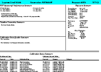 The second part of the package presents the data exposure by exposure. Usually there are three pages for each exposure: the first two pages are grayscale representations of the image (one containing all four chips together, the other featuring the PC only), and the third summarizes various exposure characteristics, flags and error conditions that might arise. The grayscale presentation on the first page of the four chips together is a crude mosaic; each chip is rotated and placed in the correct position with respect to the others, but the overlap and the small differential rotations between chips (see Chapter 24) are not corrected for. The next page presents the PC by itself, at a larger scale that brings out smaller details not evident in the mosaic. This third page, giving dataset information, is divided into several zones, each summarizing information on a specific topic: the HST Spacecraft Performance Summary, with information on pointing and jitter; the Pipeline Processing Summary, with information on whether the file was processed properly by the pipeline (see Chapter 26); the Calibration Data Quality Summary, where any inconsistencies in the choices of calibration files are highlighted; the Exposure Summary, which details when and how the exposure was taken, and the Calibration Status Summary, which reports all reference files used in the calibration and their pedigree, if available. Some basic consistency checks are carried out, and the user is alerted to any potential problems thus discovered.