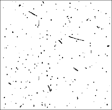 Unlike events seen on the ground, most WFPC2 cosmic ray events deposit a significant amount of charge in several pixels; the average number of pixels affected is 6, with a peak signal of 1500 e- per pixel and a few tens of e- per pixel at the edges. About 3% of the pixels, or 20,000 pixels per CCD, will be affected by cosmic rays in a long exposure (1800 s). Figure 26.6 shows the impact of cosmic rays in an 800 second exposure with WFPC2. The area shown is about 1/16th of one chip (a 200 x 200 region); pixels affected by cosmic rays are shown in black and unaffected pixels are shown in white. A typical long WFPC2 exposure (2000 s) would have about 2.5 times as many pixels corrupted by cosmic rays.