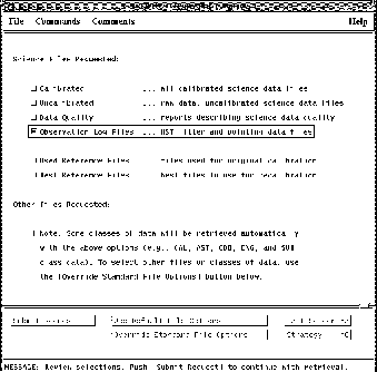 The easiest way to get OMS files through StarView is to identify the observation of interest and proceed with your request as described in Chapter 1, until you reach the <Retrieval Request - File Options> screen, reproduced in Figure C.3. You can then check the Observation Log Files box, along with any other desired boxes, and continue with your request. StarView will then deliver the associated observation log files.