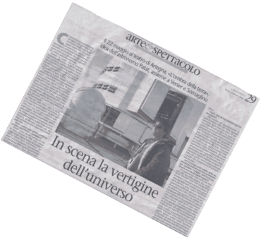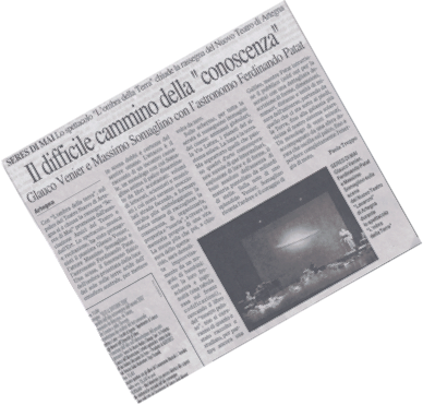 [...] La pièce nasce da una felice contaminazione fra musica, prosa ed astronomia, realizzata grazie all’impegno creativo ed inventivo di un trio del tutto eccezionale, formato dal musicista Glauco Venier, dall’attore Massimo Somaglino e dall’astronomo Ferdinando Patat.