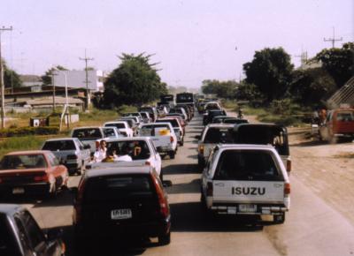 of a huge traffic jam in the middle of wind swept rice-fields as far as