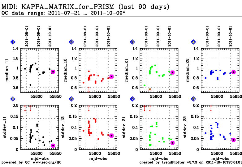 The kappa coefficients are measured using the photometric files taken with an SCI_PHOT observation. The photometry files associated to the SCI_PJHOT observation (if requested by the PI) could be used to calibrate the fringes taken in SCI_PHOT mode. For now we use a static kappa matrix (calculated accumulating 6 months or more of data) to calibrate the fringes. This is only used for instrument monitoring.