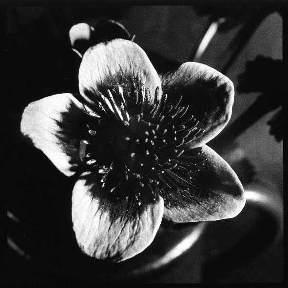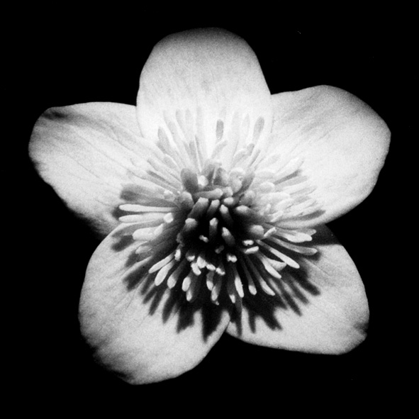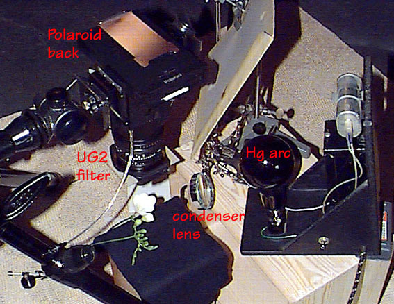 These pictures were taken with the setup shown here. I use an 80mm lens with a 56mm extension tube directly onto type 667 (3000 ASA) Polaroid print film. For maximum depth of focus the lens is set to f/22 and, with visible illumination, the exposure is very short. I use a 400W mercury arc lamp encased in UV filter envelope as a source of UV light. The arc is focussed onto the flower with a thin singlet lens and the alignment adjusted using a fluorescent screen (white paper) to examine the shadow of the flower. To avoid any fluorescent light entering the camera, I use a second UV filter (2mm of Schott UG2) over the lens. Even though the arc is powerful, exposures of around 60 sec at f/22 are necessary. The effective wavelength is determined by the strong mercury emission lines at 365nm and I have not noticed any degredation of image quality - at least with the grainy Polaroid film. I make no adjustment of focus for the UV image.