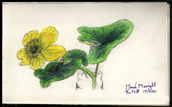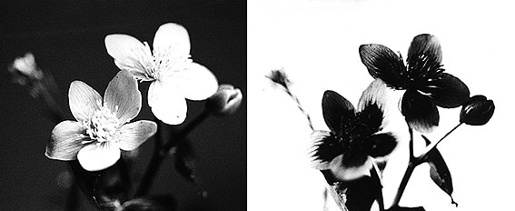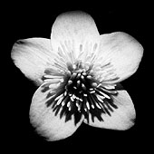 A marsh marigold flower seen at 365nm in the UV. A visible light picture of the same flower (larger version)