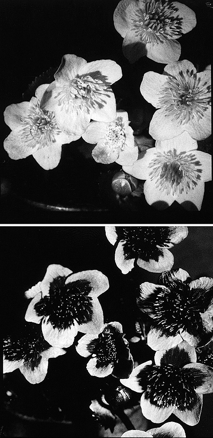 Honey bees have eyes with spectral sensitivitiy in the yellow, blue and ultraviolet (UV). Amongst these colour groups, the power to distinguish shades of colour is sharpest in the UV. Many flowers which are pollinated by bees show patterns caused by the absence of UV in certain regions which act as guide marks to help the bee find the nectar and so brush the pollen. While about a third of flowers exhibit patterns in visible light, an additional quarter show patterns only in the UV - an example is the marsh marigold shown above. A more dramatic comparison between visible and UV appearance is shown by a bunch of flower heads. These pictures illustrate the adaptation of the flower to the bee's preference for UV-dark central regions.