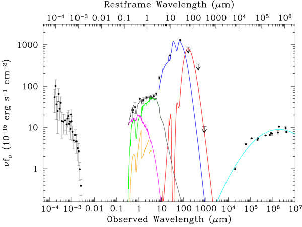 Figure 1: X-ray to radio spectral energy distribution (SED) of the z=2.483 radio galaxy 4C+23.56 (De Breuck et al. in preparation). All data points are observed flux densities, except for the J, H and K-band fluxes, which have been corrected for strong emission lines. Coloured lines show the decomposition of the SED into different intimately related components. The accretion onto the supermassive black hole creates very energetic X-ray and UV emission and powerful synchrotron radio jets and lobes. In this typical radio loud, type 2 AGN, the direct view to the nucleus is blocked by an obscuring torus absorbing the soft X-ray radiation that is re-emitted as hot thermal dust emission (blue). Radiation escaping through the torus opening is scattered toward the observer providing a unique periscopic view of the nucleus (magenta). It also ionises the ISM producing nebular continuum emission (orange) and, of course, line emission (which is not shown). The massive stellar host galaxy is seen directly in the rest-frame near-IR (green), while an obscured starburst is revealed by sub-mm cool dust re-emission (red). The bolometric contributions from the accretion onto the supermassive black hole and the stellar nucleosynthesis are remarkably similar.