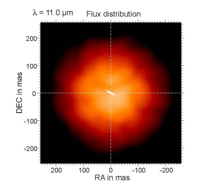 Figure 2: Flux distribution of the emission from warm dust in the nucleus of the Circinus galaxy. The emission was modelled according to interferometric data obtained with MIDI at the VLTI using two elliptical, Gaussian black body emitters with silicate absorption. The dust is distributed in two components: (1) a small, disk-like component which is oriented perpendicularly to the ionisation cone and outflow and coincides with the orientation and size of a maser disk as well as (2) a larger torus which surrounds the disk component and which shows strong evidence for clumpiness. This finding strongly supports the unified scheme of AGN. (Courtesy Konrad Tristram, tristram@mpia-hd.mpg.de)