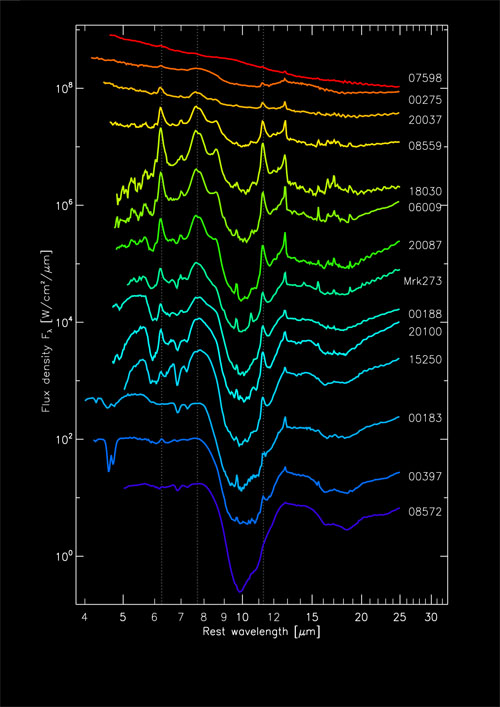 Figure 3: This collage of low-resolution Spitzer-IRS spectra offers a striking illustration of the diverse nature of the galaxies classified as ultraluminous infrared galaxies (ULIRGs). The reddish spectra at the top are nearly featureless, typical of AGN heated hot dust. Further down, the family of PAH emission features at 6.2, 7.7, 8.6 and 11.3 microns start to appear, indicating an increased contribution of star forming regions to the ULIRG spectrum. The PAH emission starts to dominate in the greenish spectra, while silicate absorption at both 10 and 18 microns becomes apparent. In the spectrum of IRAS 20087, the characteristic absorption edge of water ice at 5.7 microns starts to appear as well, indicating the presence of shielded cold molecular clouds along the line of sight. The water ice feature deepens and the importance of PAH emission decreases moving down to the spectra shown in glacial blue. At the same time, the depth of the 10 and 18 micrometer silicate features increases and hydrocarbon absorption bands at 6.85 and 7.25 microns become apparent, indicating that the power sources of these ULIRGs are deeply embedded. The bottom three spectra differ from those directly above by the presence of a strong near-infrared continuum and by the relative weakness of the 5.5 to 8.0 micrometer absorption features. Note how, due to the appreciable redshifts of IRAS 00183 and IRAS 00397, the IRS spectral coverage extends all the way down to rest frame wavelength of 4 microns, facilitating the discovery of wide absorption features due to warm CO gas at 4.6 microns in their spectra. (Spoon et al. (2006, IAU Symposium 231 "Astrochemistry: Recent Successes and Current Challenges", eds. D.C. Lis, G.A. Blake and E. Herbst, IAU Symp. 231, 281 (astro-ph/0512037); Spoon et al. 2007, ApJ 654, L49)