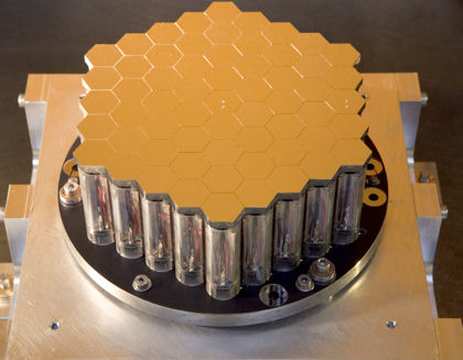 Active segmented mirror completion The 61 segments of the active segmented mirror (ASM) developped for APE project have been fully integrated by Christophe Dupuy. It has been designed at ESO to simulate primary segmentation in APE by imaging on it the VLT pupil over a diameter of 130 mm. The size of the segments and the distance between two mirror edges are approximately 100 times smaller than of an ELT. Each segment of this key subsystem is controlled with a resolution of the order of a few nanometers, in Piston, Tip and Tilt by means of piezo actuators having a stroke of 30 µm. More on the ASM here.
