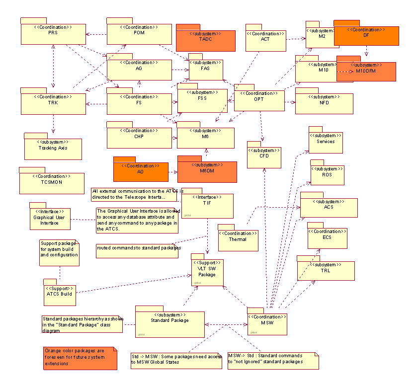 The table below lists the support packages within the scope of ATCS. It includes general system configuration packages as well as basic packages that implement standard design patterns and functionality defined at higher VLT level, like for example the behavior of standard commands, protocols for error handling and so on.