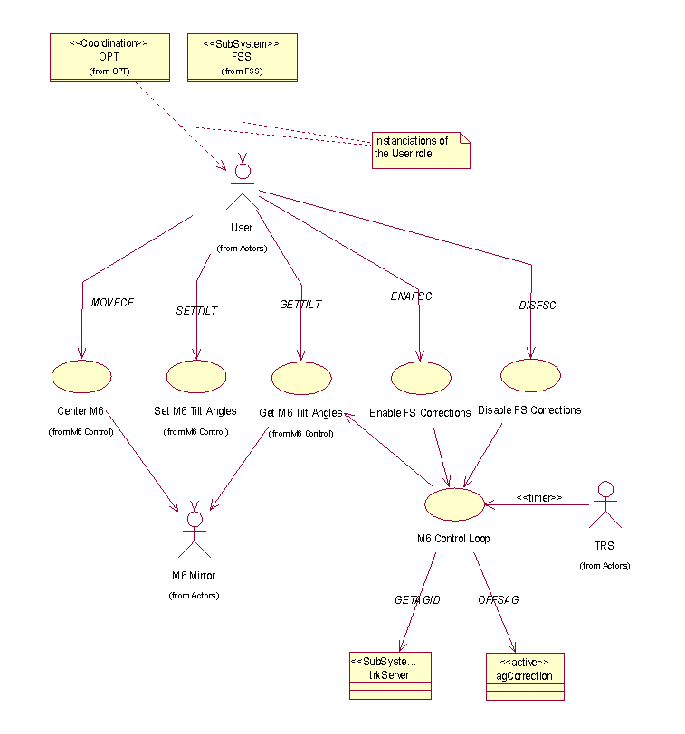 The communication mechanism between this control loop running on the Sensor LCU and the tracking servers of the main telescope axes, running on the Altitude, resp. Azimuth LCU is an exception to the VLT conventions relative to the message system, since here one LCU is sending messages to another LCU. This exception has been agreed on the UTs for performance reasons. However, no second Ethernet connection is required, since the requirements in terms of bandwidth are low (up to one correction per second). In addition, in order to reduce the traffic to its minimum, only a message of type reply is sent, i.e. one message only (instead of 4 for a command type message).