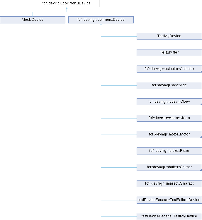 Implemented in MockIDevice, TestShutter, testDeviceFacade::TestMyDevice, testDeviceFacade::TestFailureDevice, TestMyDevice, fcf::devmgr::actuator::Actuator, fcf::devmgr::adc::Adc, fcf::devmgr::drot::Drot, fcf::devmgr::iodev::IODev, fcf::devmgr::lamp::Lamp, fcf::devmgr::maxis::MAxis, fcf::devmgr::motor::Motor, fcf::devmgr::piezo::Piezo, fcf::devmgr::shutter::Shutter, and fcf::devmgr::smaract::Smaract.