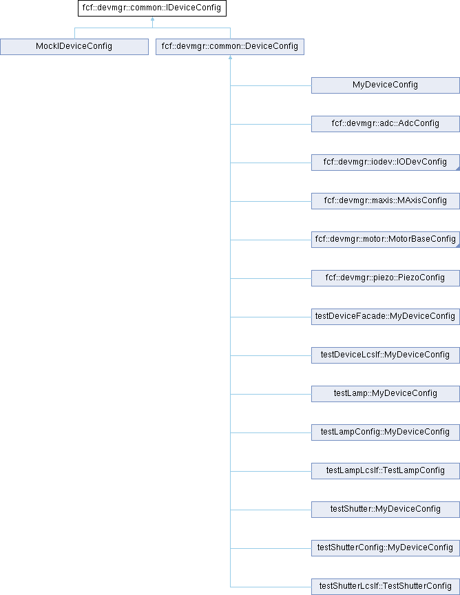 Implemented in fcf::devmgr::common::DeviceConfig, MyDeviceConfig, testDrotConfig::MyDeviceConfig, testDrotLcsIf::TestDrotConfig, TestIODev::MyDeviceConfig, testIODevConfig::MyDeviceConfig, testIODevLcsIf::TestIODevConfig, testLampConfig::MyDeviceConfig, testLampLcsIf::TestLampConfig, testMotorConfig::MyDeviceConfig, testMotorLcsIf::TestMotorConfig, testShutterConfig::MyDeviceConfig, and testShutterLcsIf::TestShutterConfig.