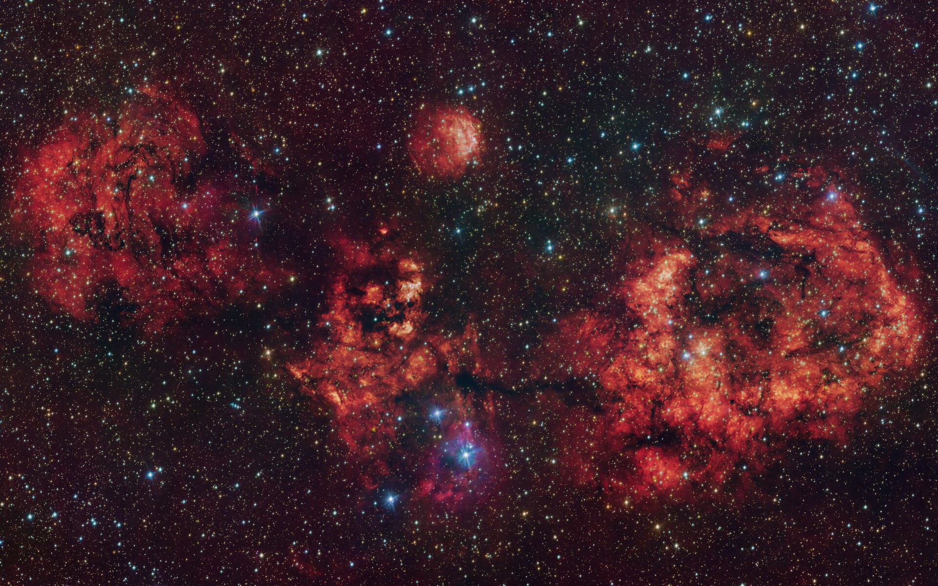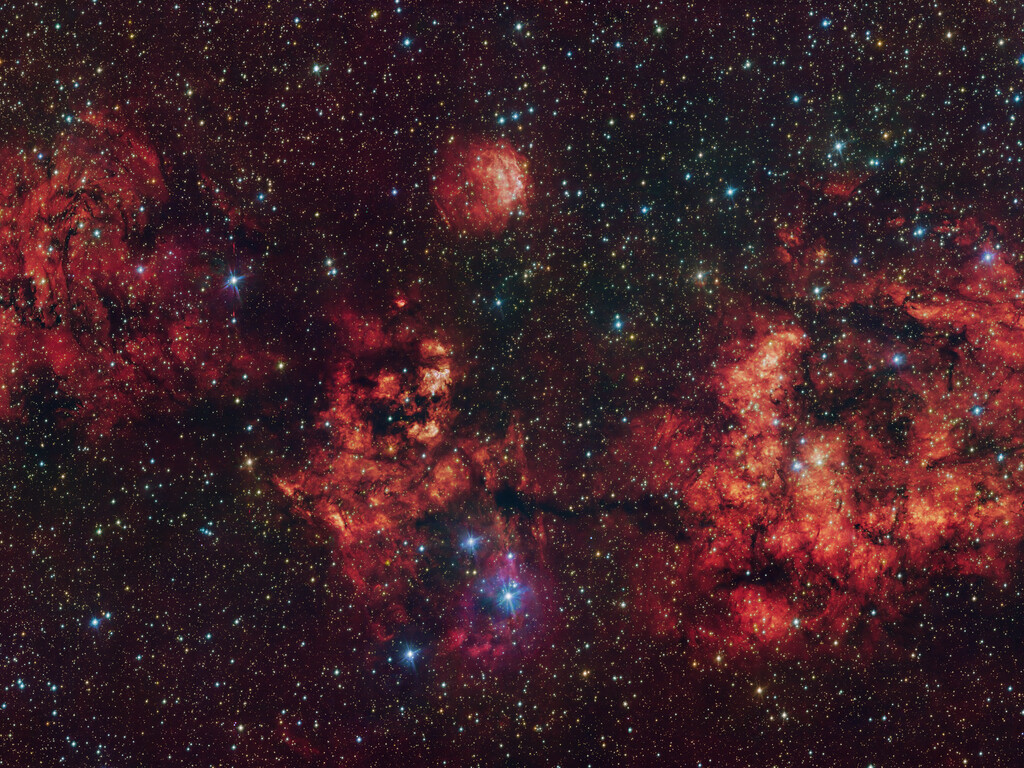 Deze afbeelding toont een wolk van gas en stof in de vorm van een kosmische vleermuis. De afbeelding is gemaakt in zichtbaar licht met de VLT Survey Telescope (VST) van de ESO-sterrenwacht op Paranal in Chili. De intens rode gloed is afkomstig van waterstofatomen die zijn geïoniseerd door de felle straling van de jonge sterren in de wolk.