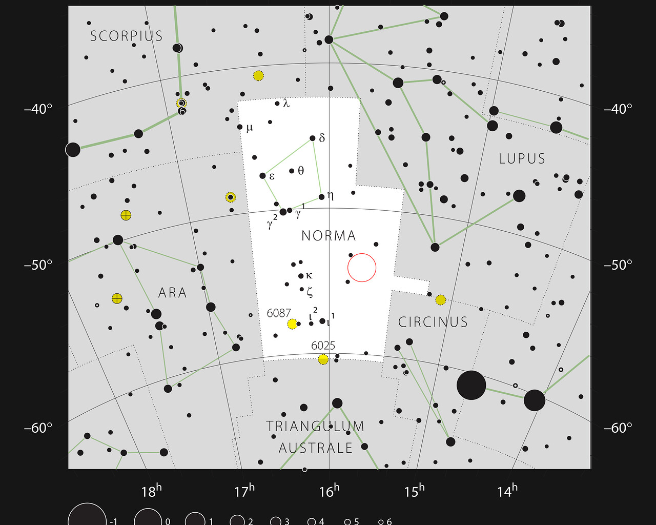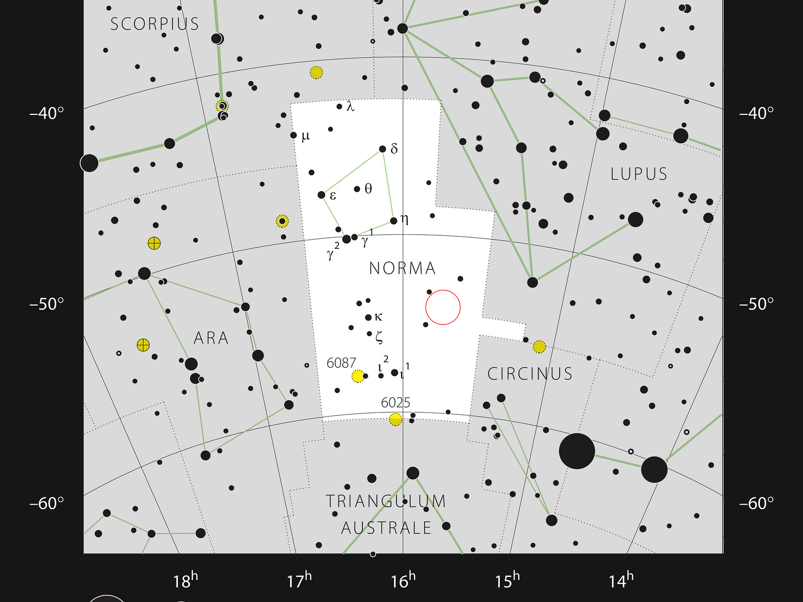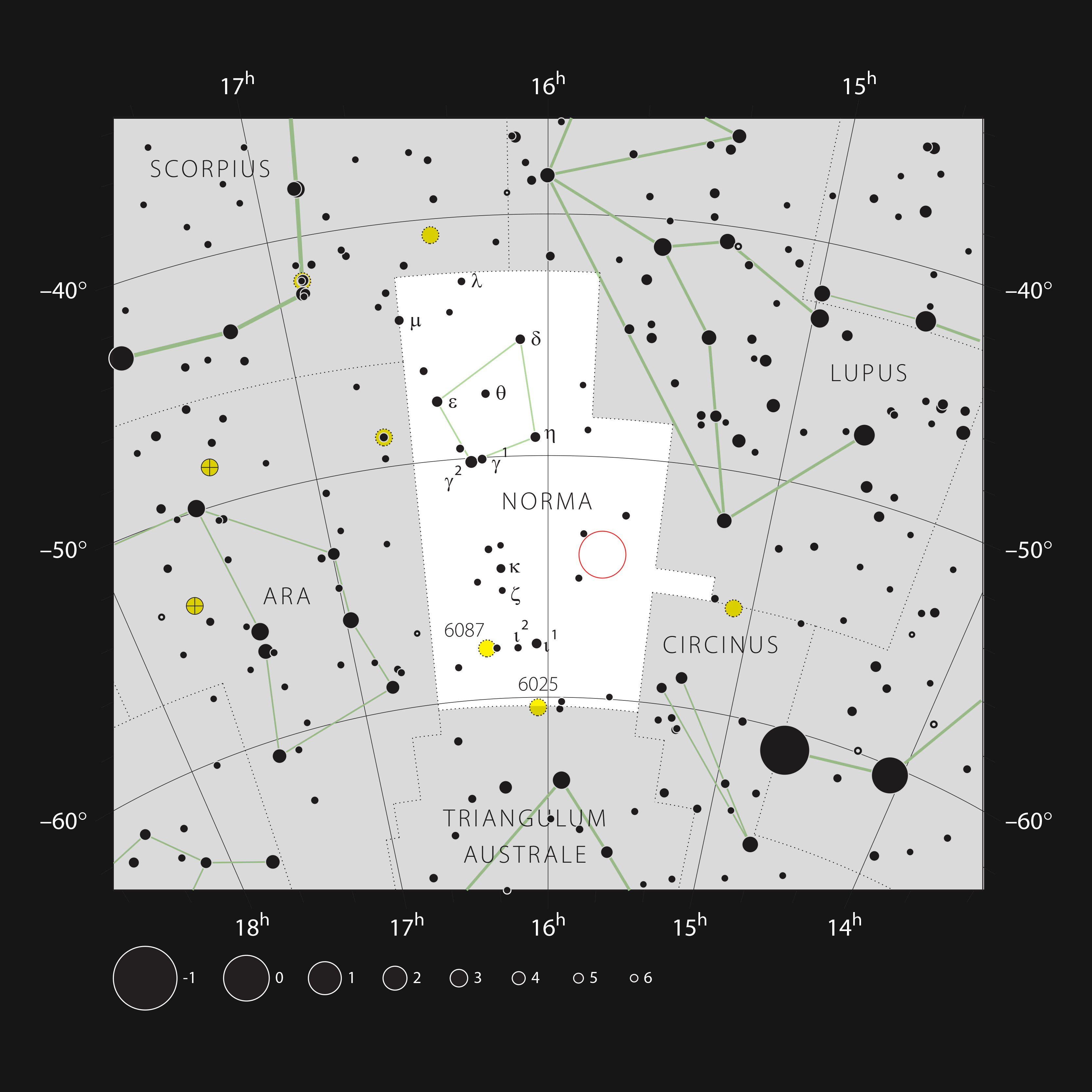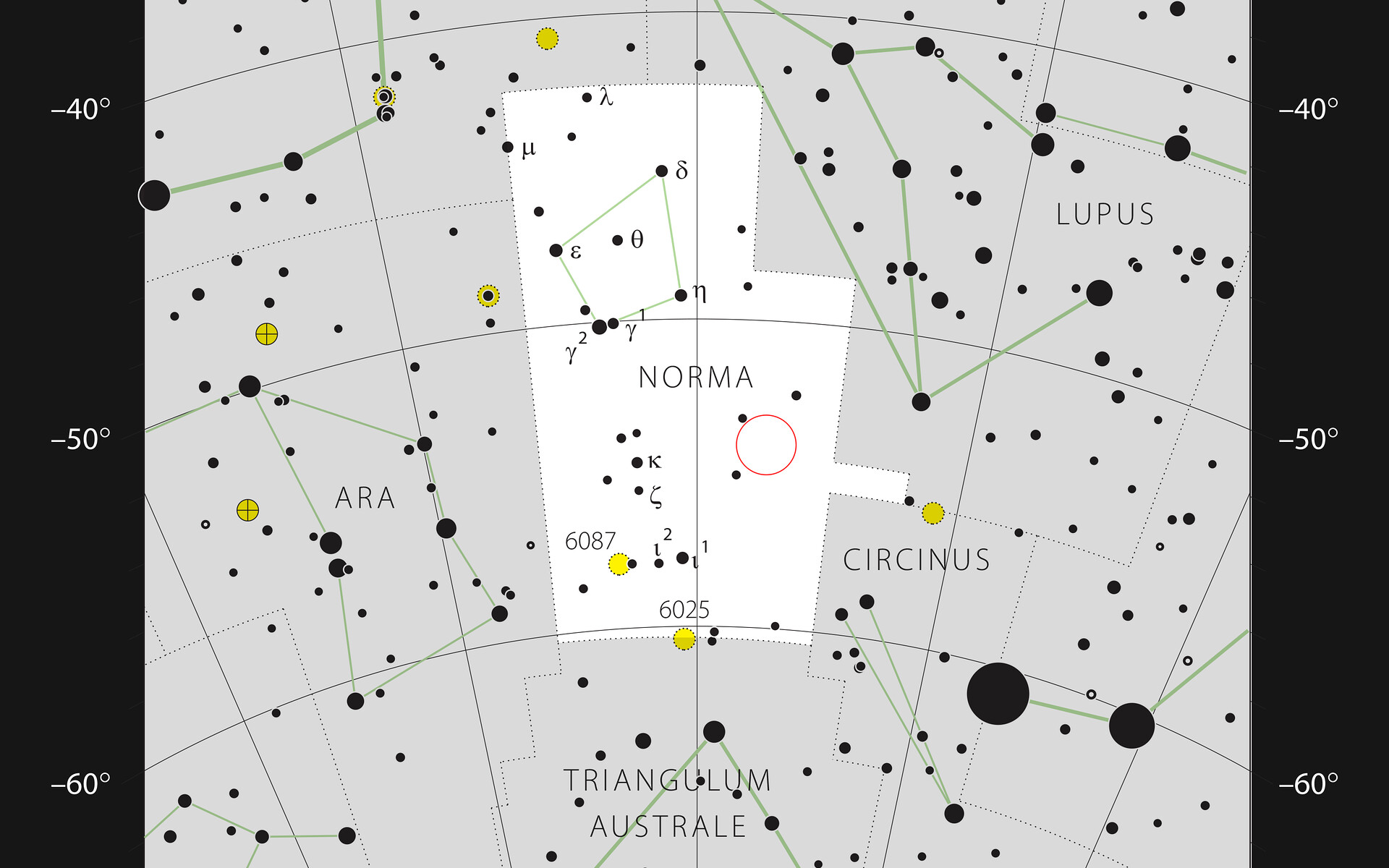 Deze kaart toont de locaties van de nevels RCW 94 en RCW 95 tussen de zuidelijke sterrenbeelden Circinus en Norma. Bijna alle sterren op deze kaart zijn onder goede omstandigheden waarneembaar met het blote oog. De locaties van de nevels zijn rood omcirkeld.
