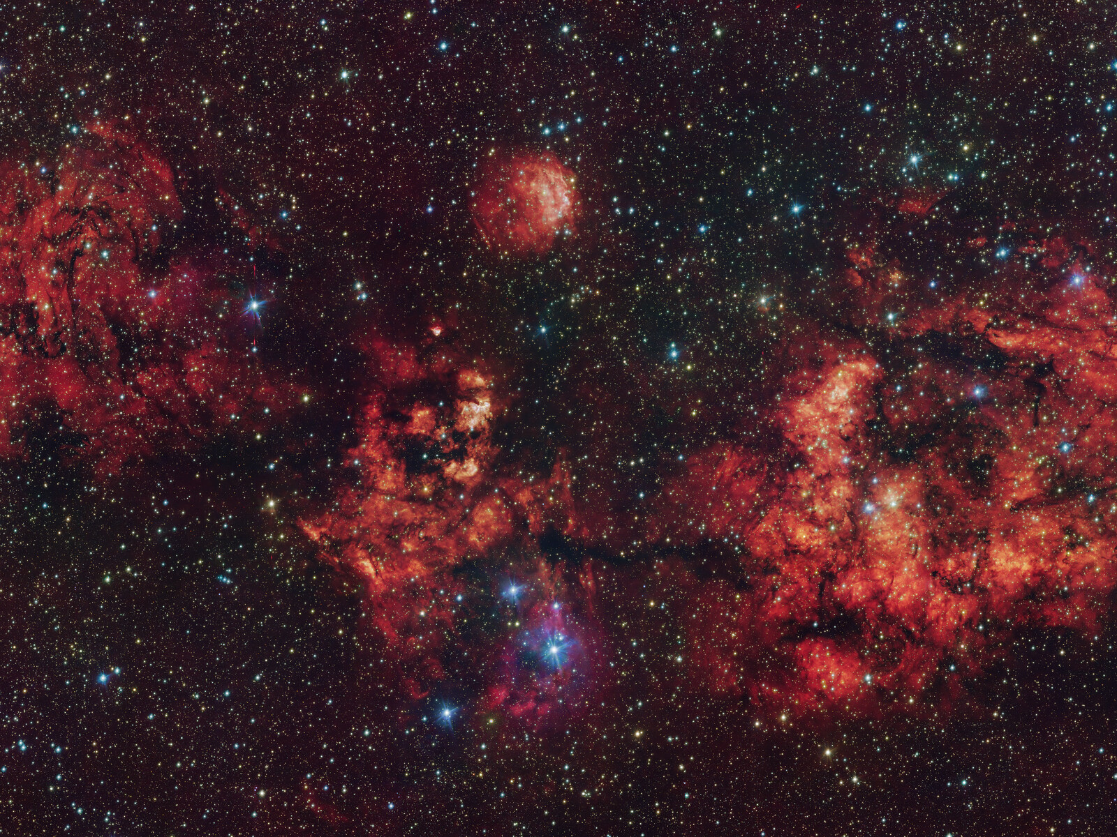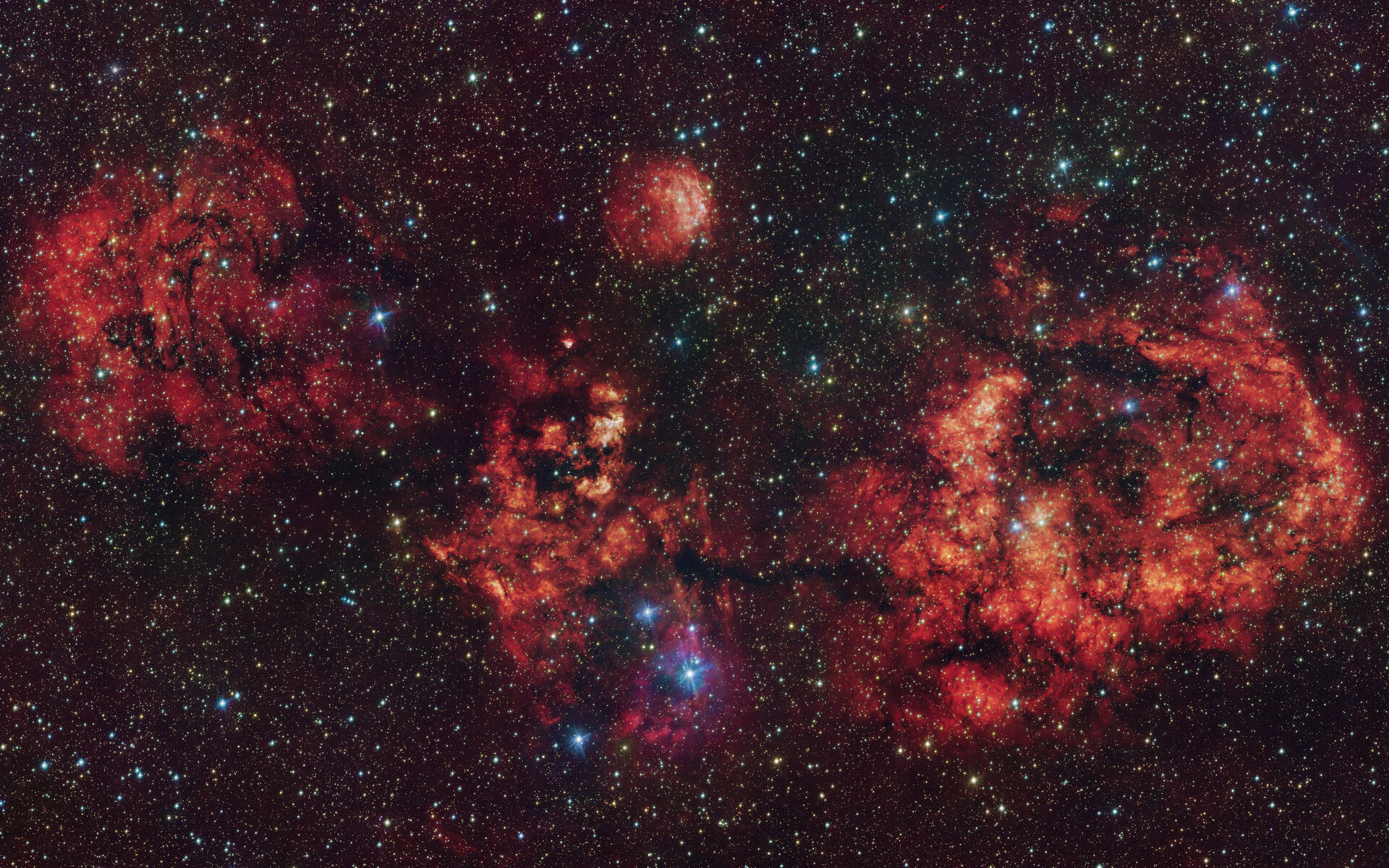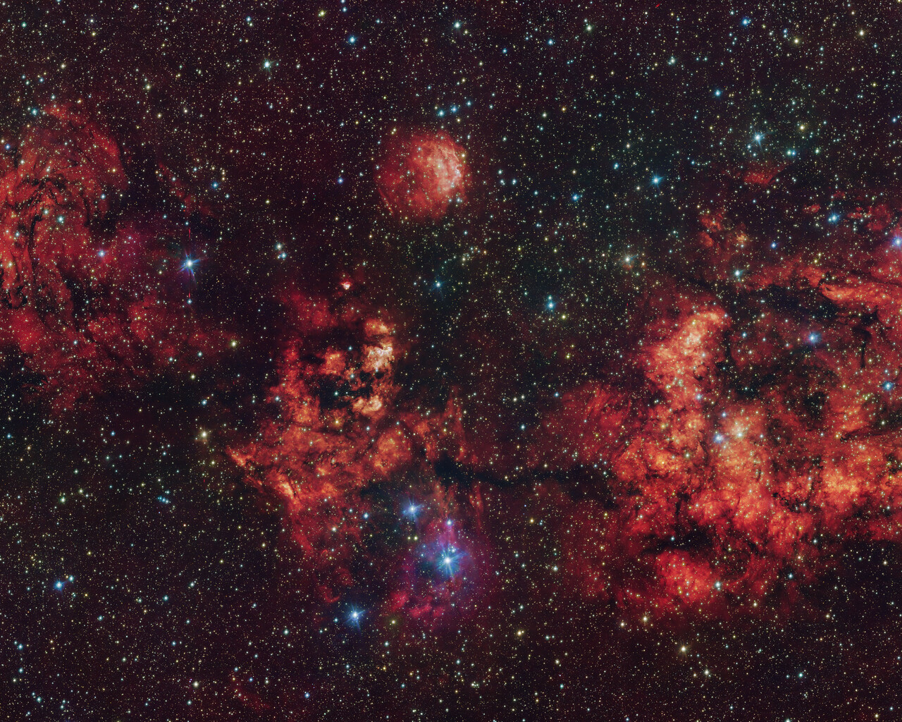 Tento snímek zachycuje oblak plynu a prachu ve tvaru kosmického netopýra. Snímek byl pořízen převážně ve viditelném světle pomocí dalekohledu VST (VLT Survey Telescope) na observatoři ESO v chilském Paranalu. Intenzivní červená záře pochází z atomů vodíku ionizovaných intenzivním zářením mladých hvězd uvnitř oblaku. Snímek také obsahuje další infračervená data pořízená dalekohledem VISTA (Visible and Infrared Survey Telescope for Astronomy) ESO, který se rovněž nachází v Paranalu.
