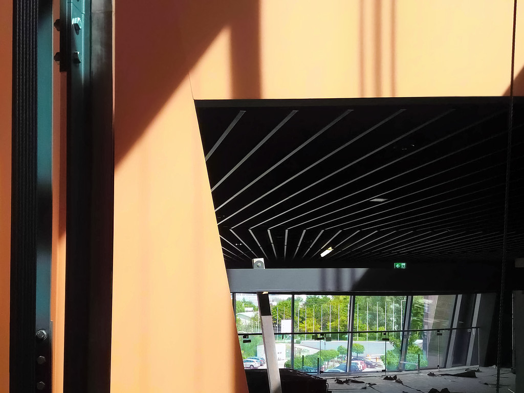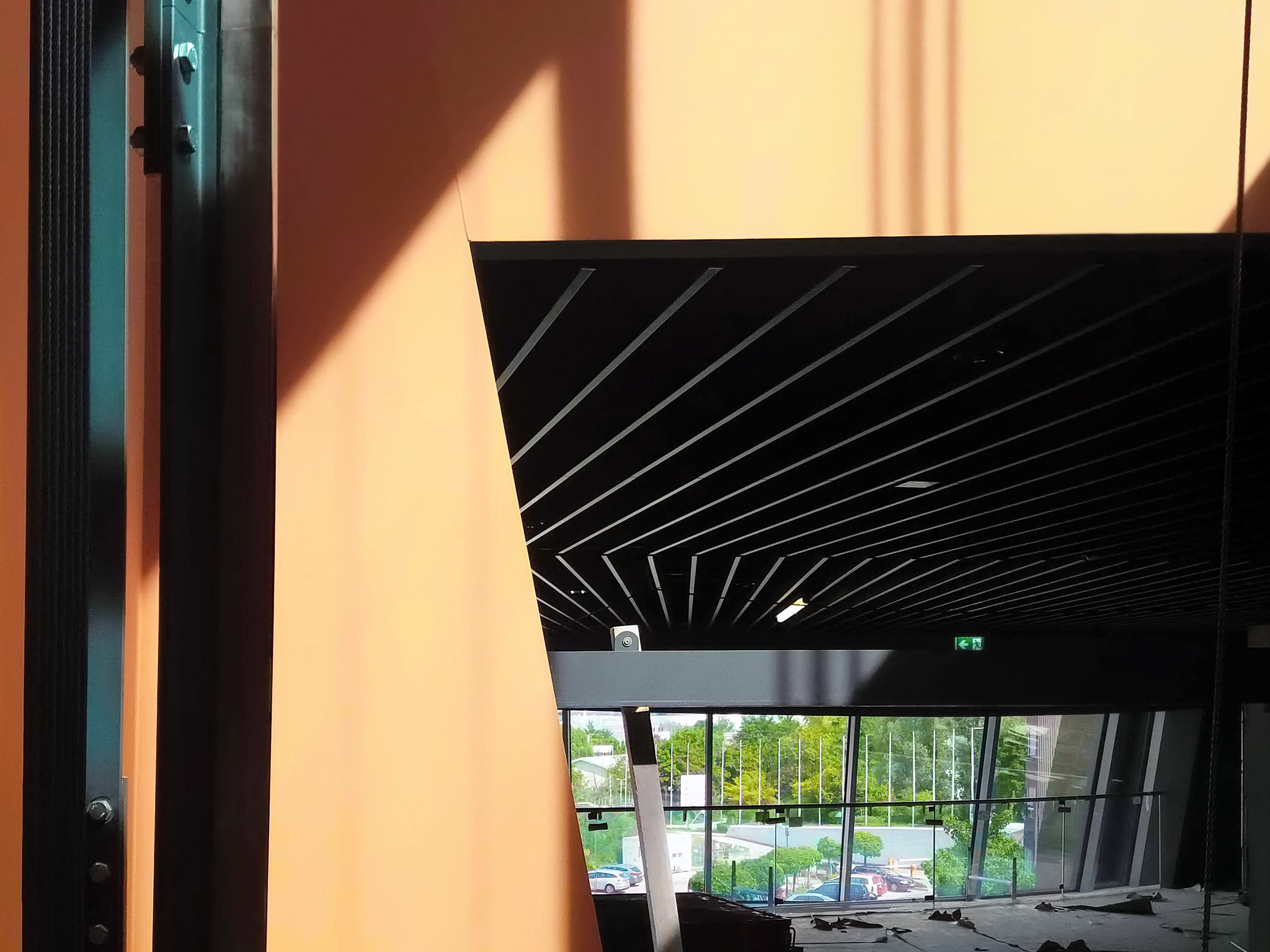 Inside the ESO Supernova Planetarium & Visitor Centre, a lift can take visitors to all floors of the exhibtion. This photo is taken from the inside whilst construction was still ongoing and has a nice architectural feel.
