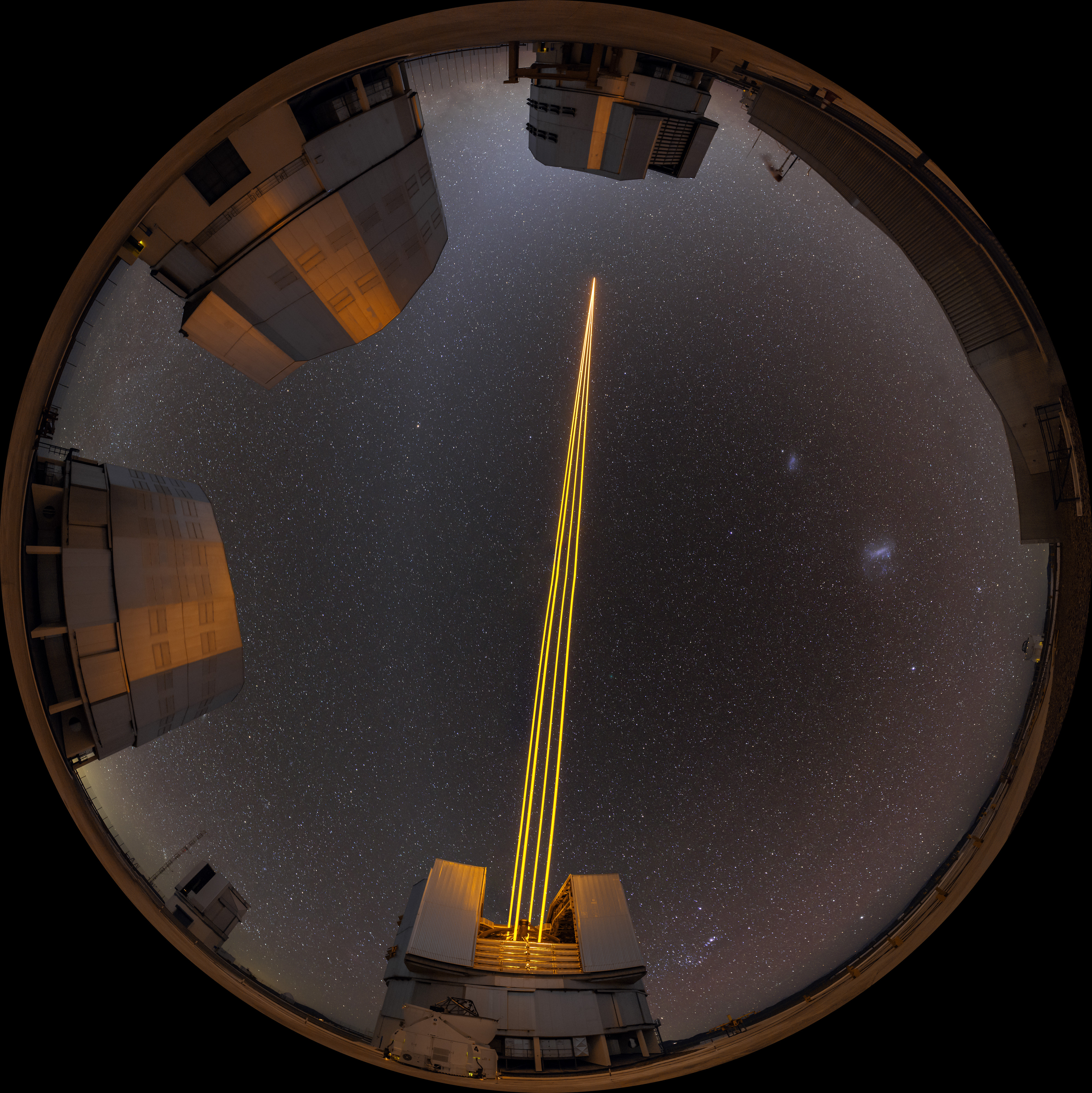 Laser light from Unit Telescope 4 (Yepun) of ESO's VLT cuts across the sky in this fisheye still from Paranal. The laser light creates an artificial guide star that is part of the state-of-the-art Adaptive Optics technology, a system that corrects the blurring effects of the Earth's atmosphere to create sharper images of the sky, allowing astronomers to study the Universe in greater detail. The other three unit telescopes are also visible around the edge of the fisheye, anticlockwise from the top: Antu, Kueyen and Melipal.