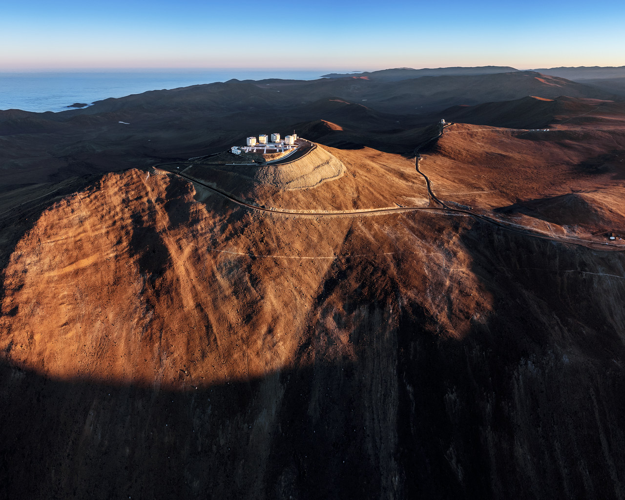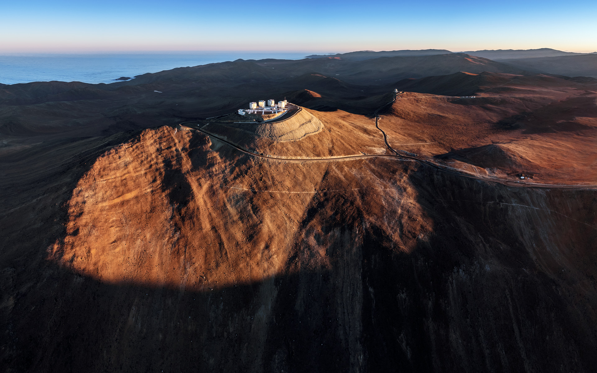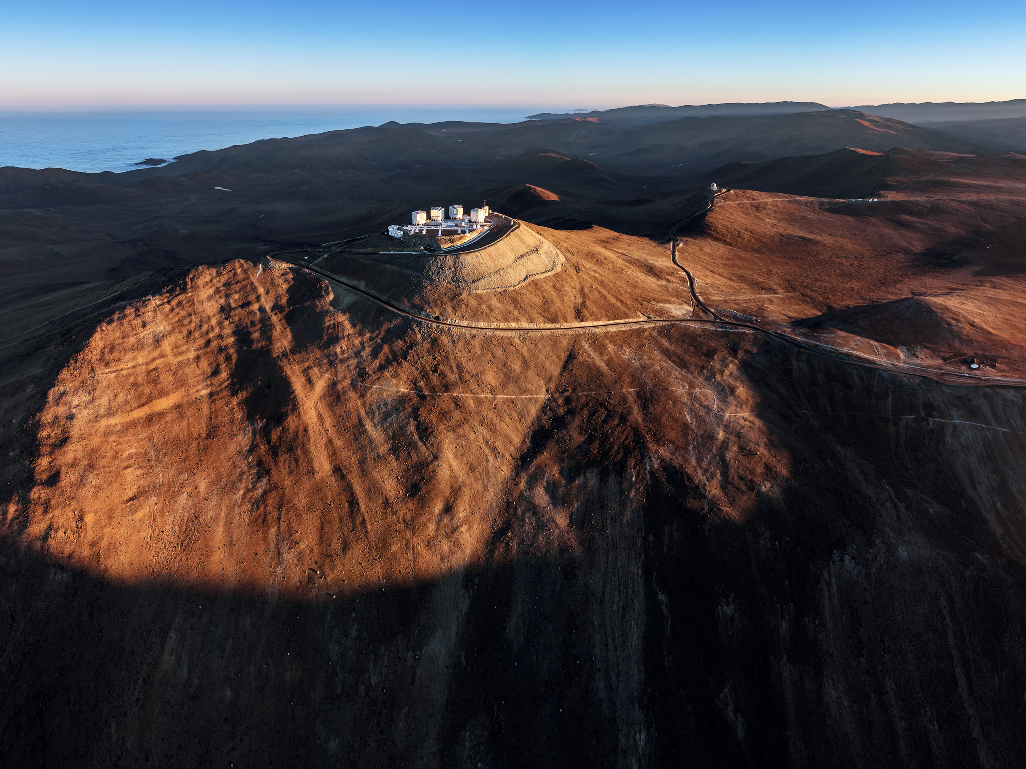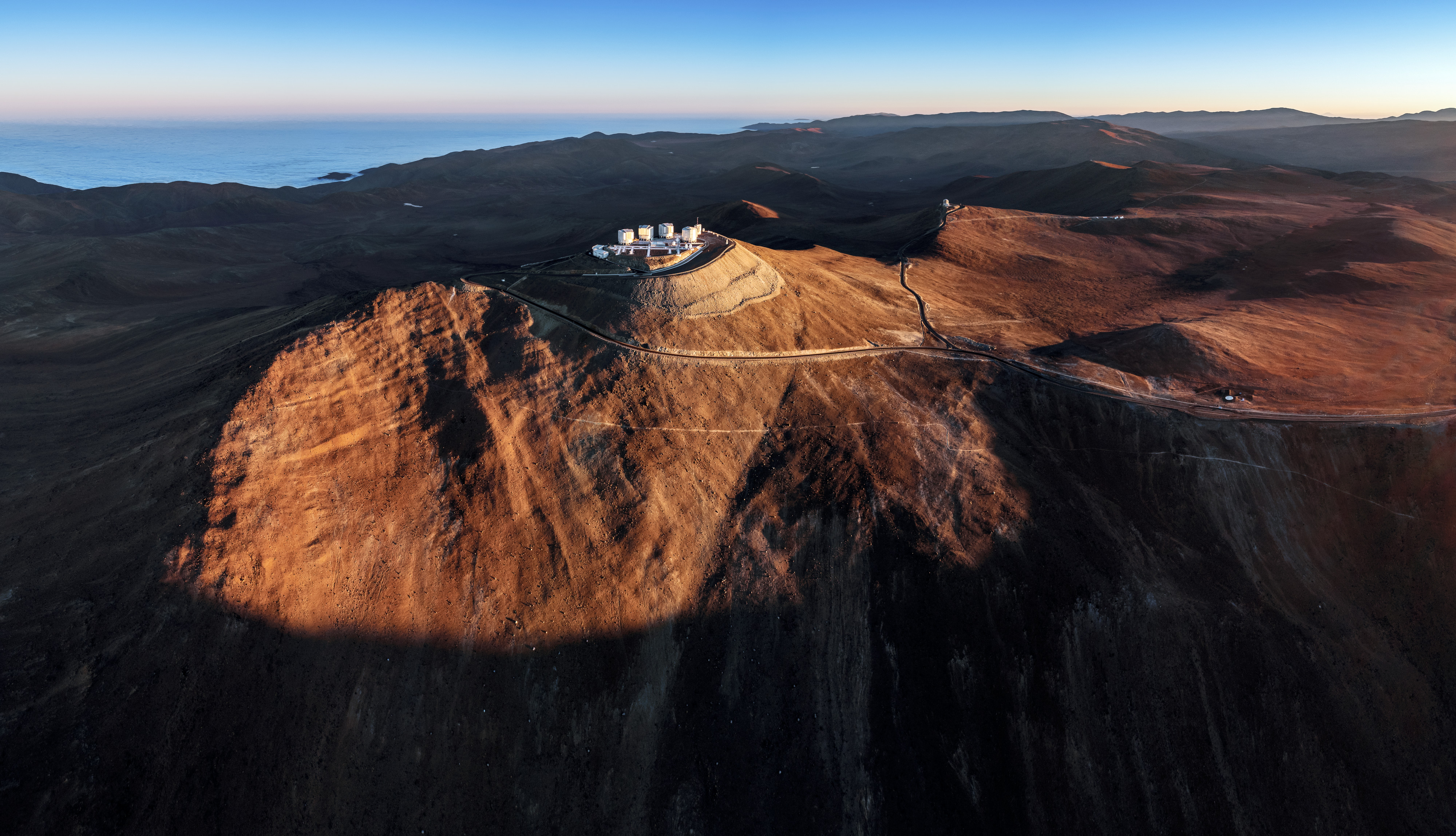 An image showing Cerro Paranal, home of ESO's flagship Very Large Telescope (VLT), visible in the center of the image. The rest of the telescopes of Paranal Observatory can be glimpsed behind it: VISTA, whose dome is visible atop another prominance, and to its right NGTS and SPECULOOS. Although it can be a difficult and isolated place for humans, Cerro Paranal is perfect for astronomy. Because it's far from cities it's spared the light pollution that dominates the sky in many portions of the world, and the typically calm, dry air above it blurring scattering caused by atmospheric conditions.