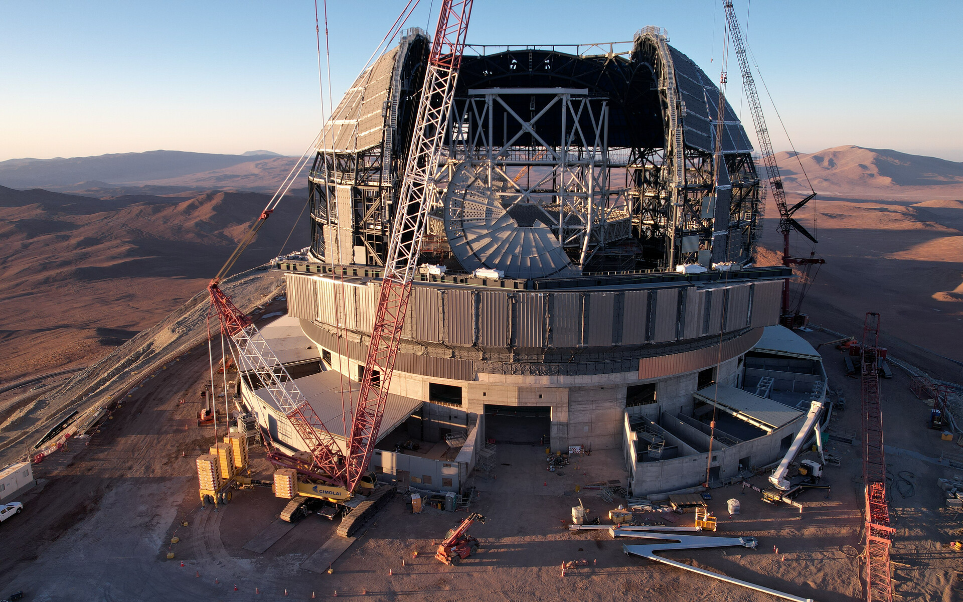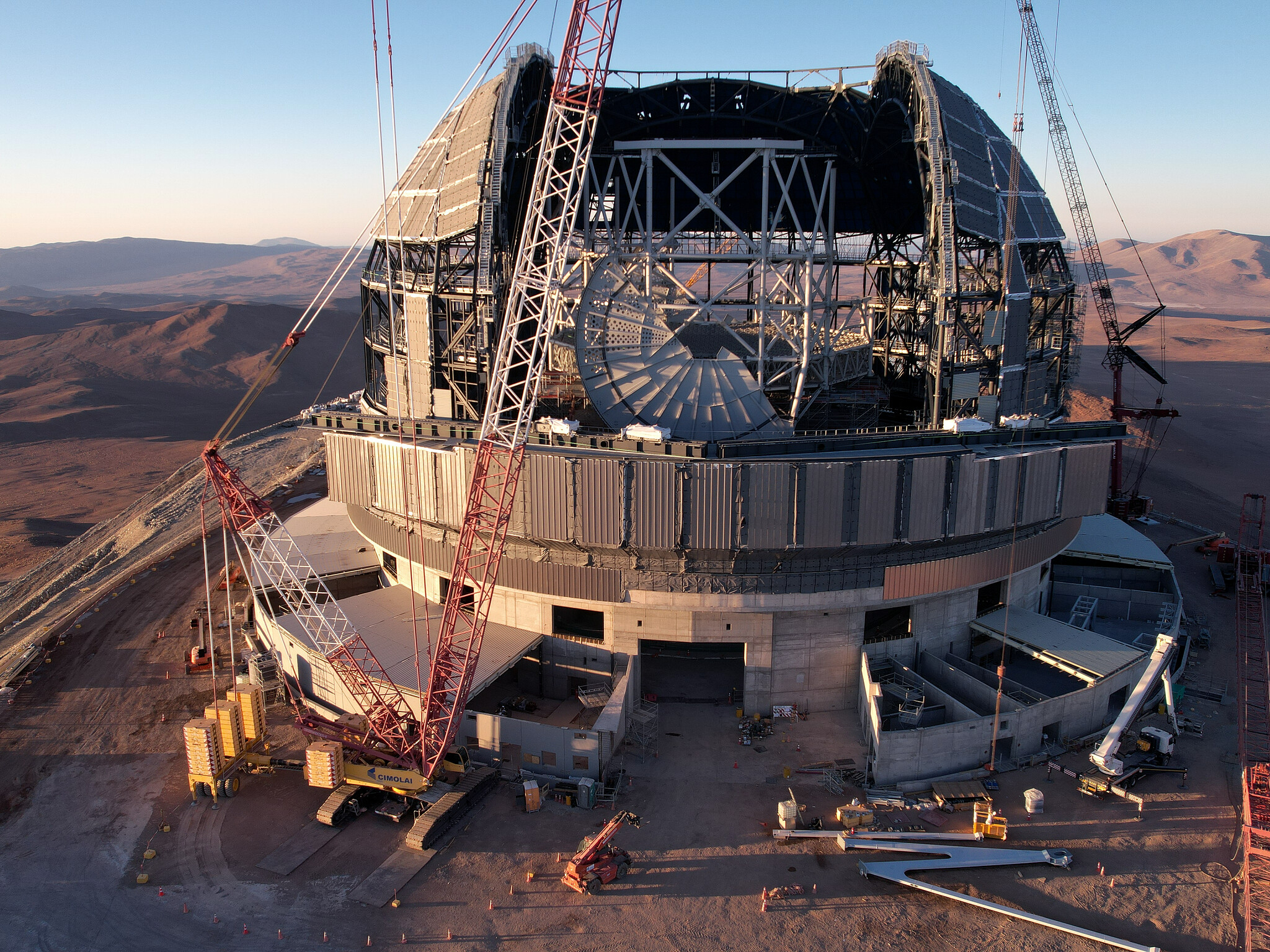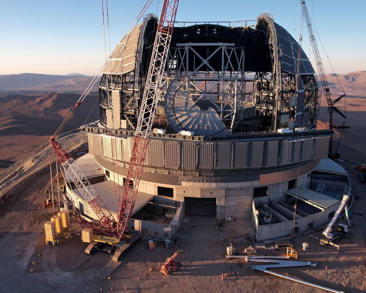 Everything is big in this drone picture taken at the construction site of ESO's Extremely Large Telescope's (ELT). The dome and the gigantic telescope structure inside dwarf everything around it. As work on the dome progresses, the telescope structure is taking shape as well; it will eventually hold five mirrors, including the enormous 39-metre primary mirror. This large structure has to be lightweight, because it has to be able to move, but at the same time it must be sturdy enough to hold the mirrors precisely in place to guarantee high-quality images.
