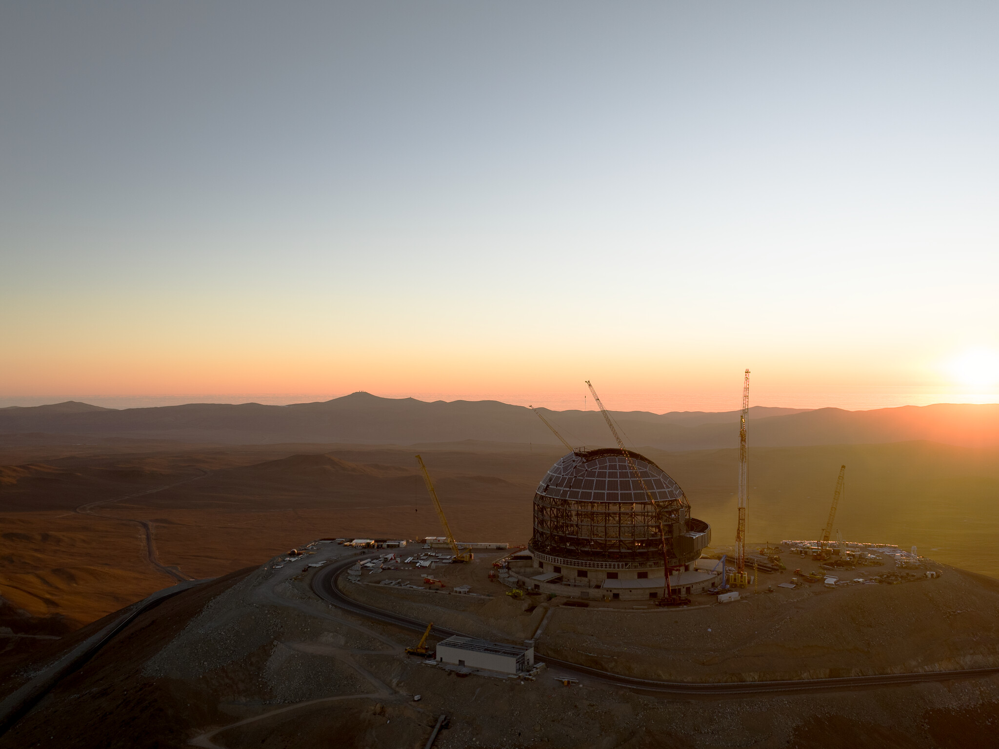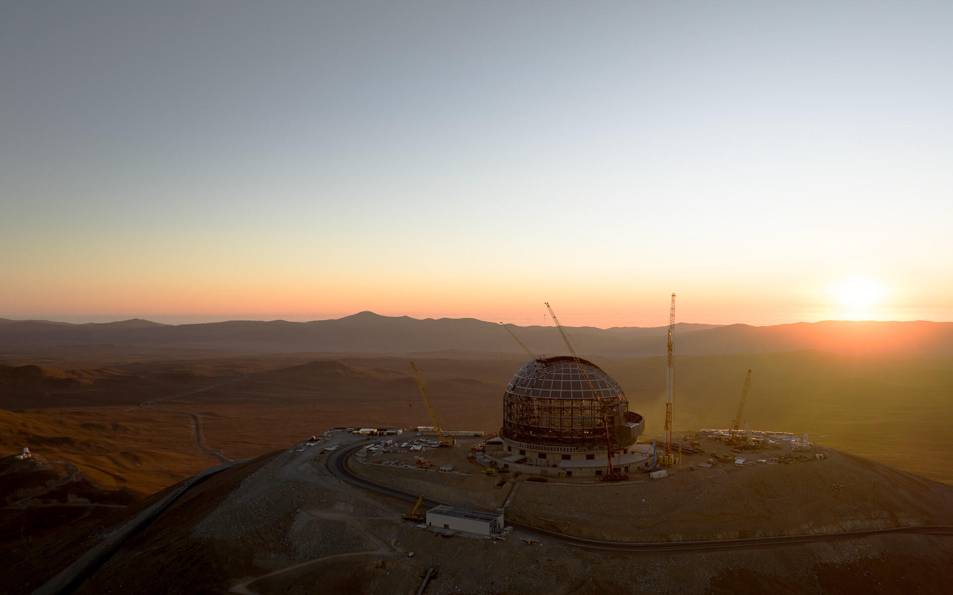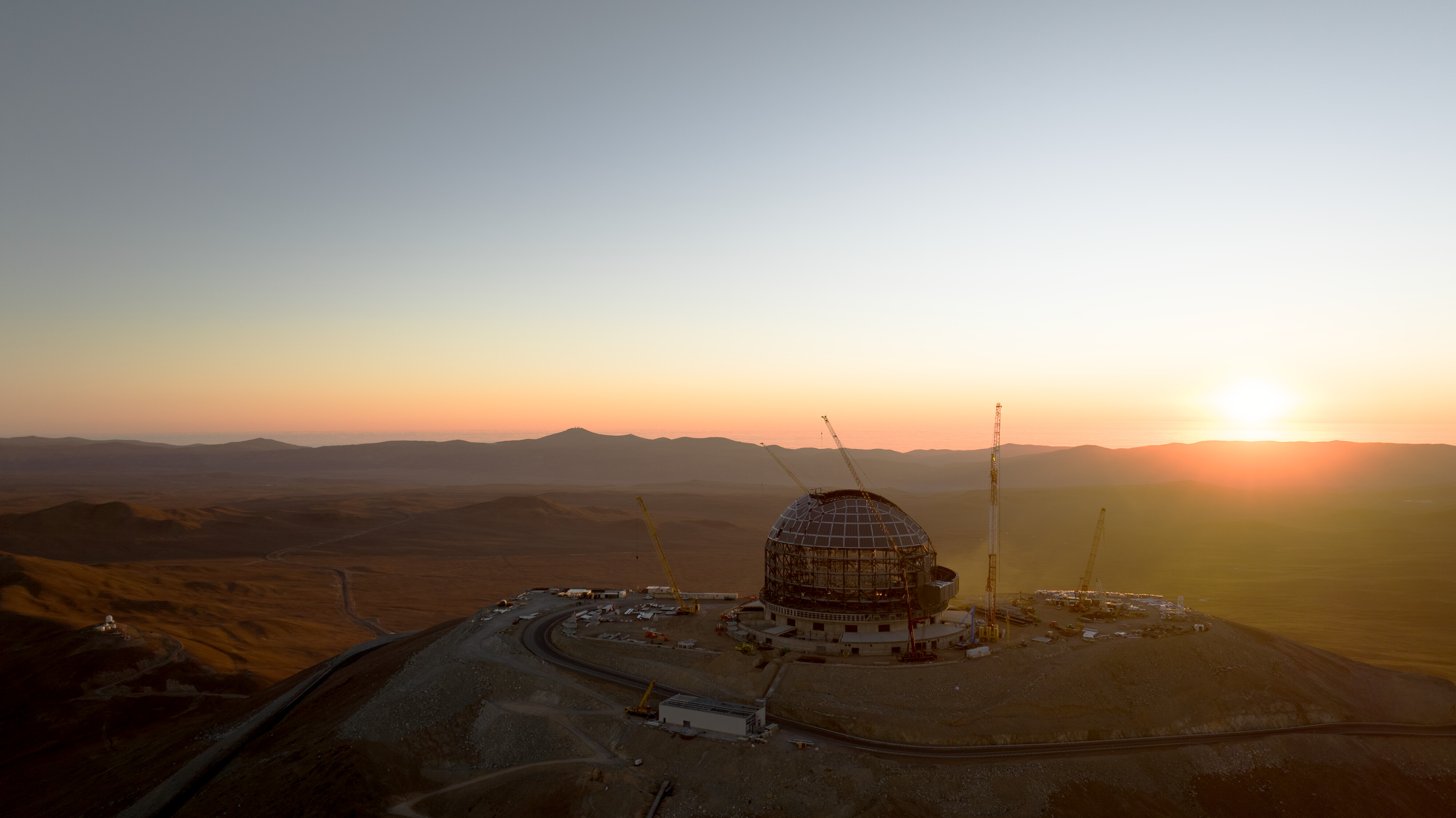 This sunset view of ESO's Extremely Large Telescope (ELT) dome, located on Cerro Armazones in the Atacama Desert, Chile, was taken from drone footage from June 2024. The white buildings of Cerro Murphy Observatory are visible to the left, and if you look closer at the silhouette of the mountains, you may even see the Very Large Telescope (VLT), the VLT Survey Telescope (VST) and the Visible and Infrared Survey Telescope for Astronomy (VISTA) perched on top.