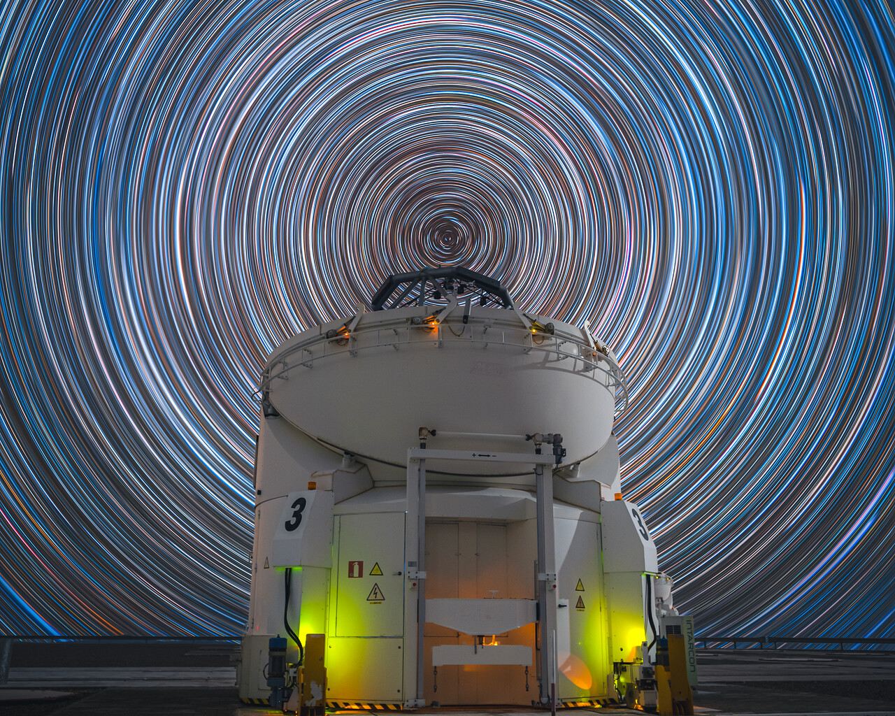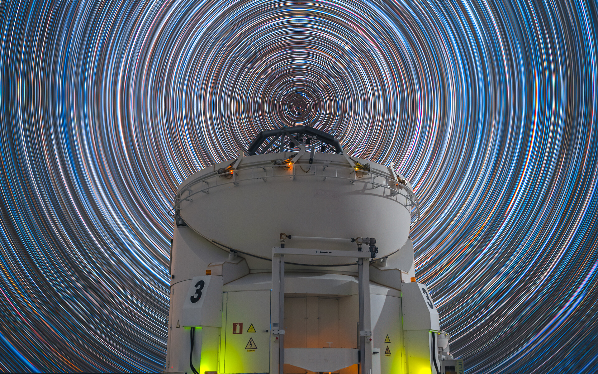 Osvaldo was able to capture this hypnotising motion at ESO’s Paranal Observatory in Chile. With the tip of one of the Auxiliary Telescopes almost perfectly aligning with the southern celestial pole, it seems as if the sky revolves around the telescope, making it the centre of attention.