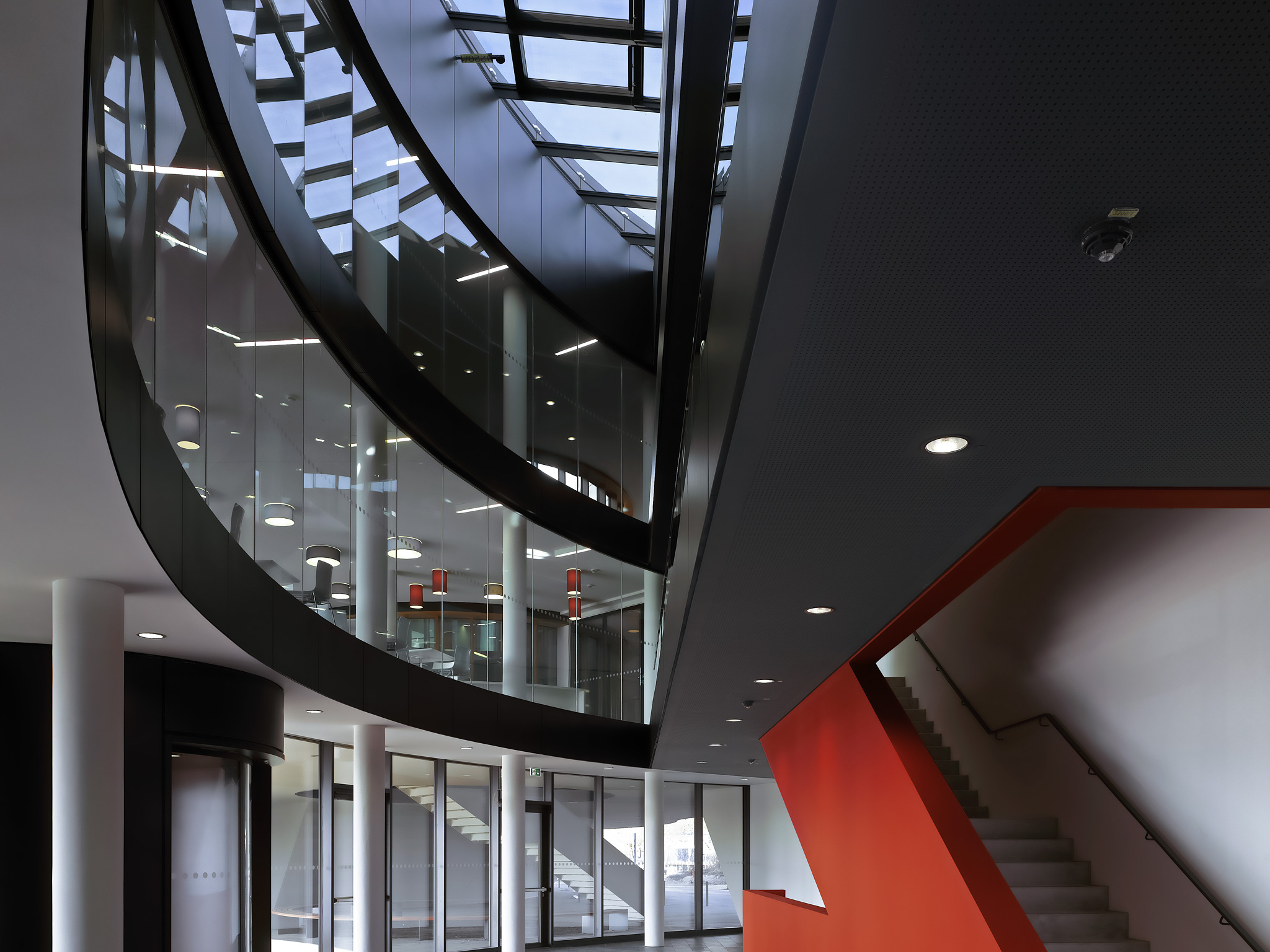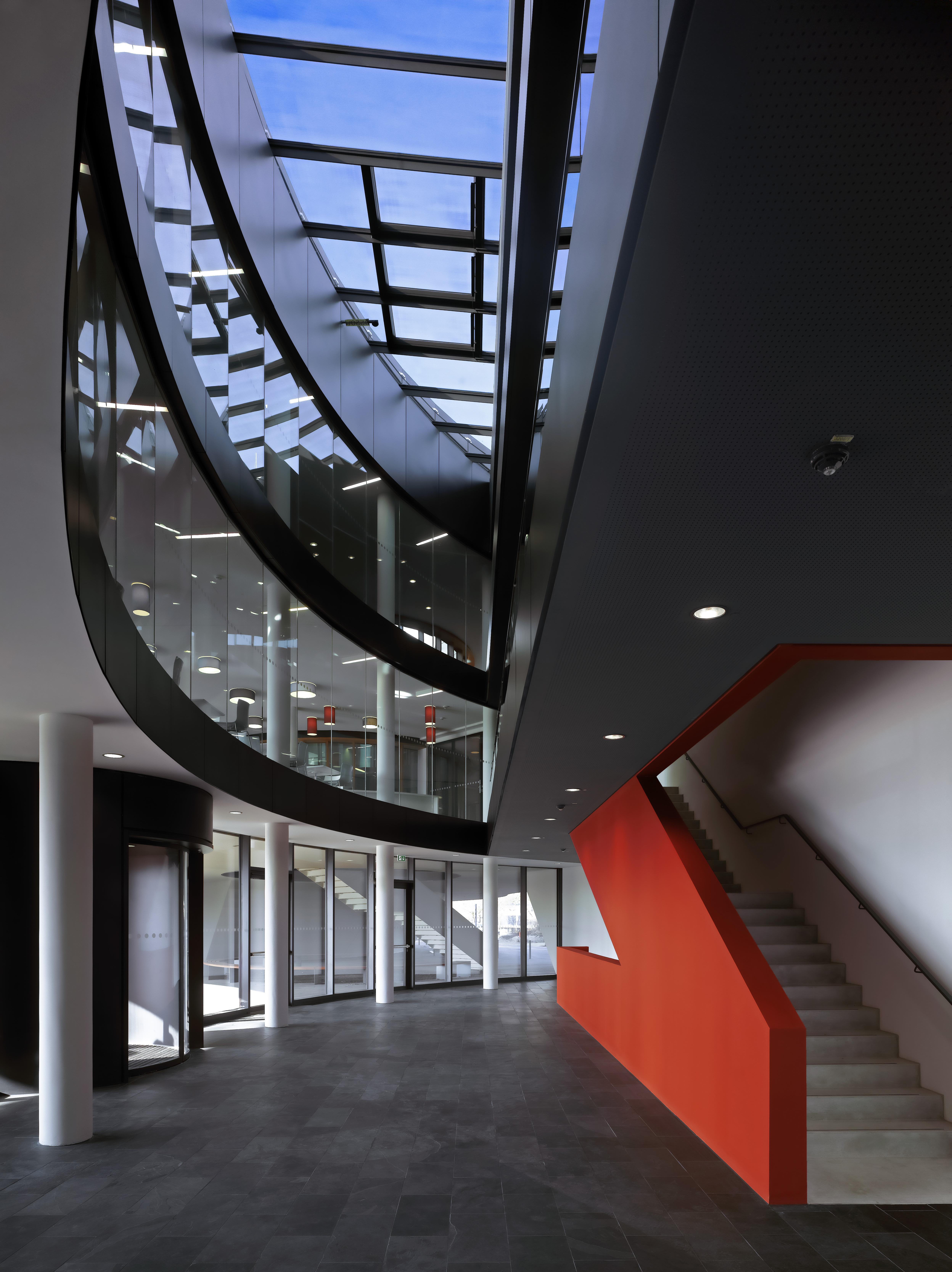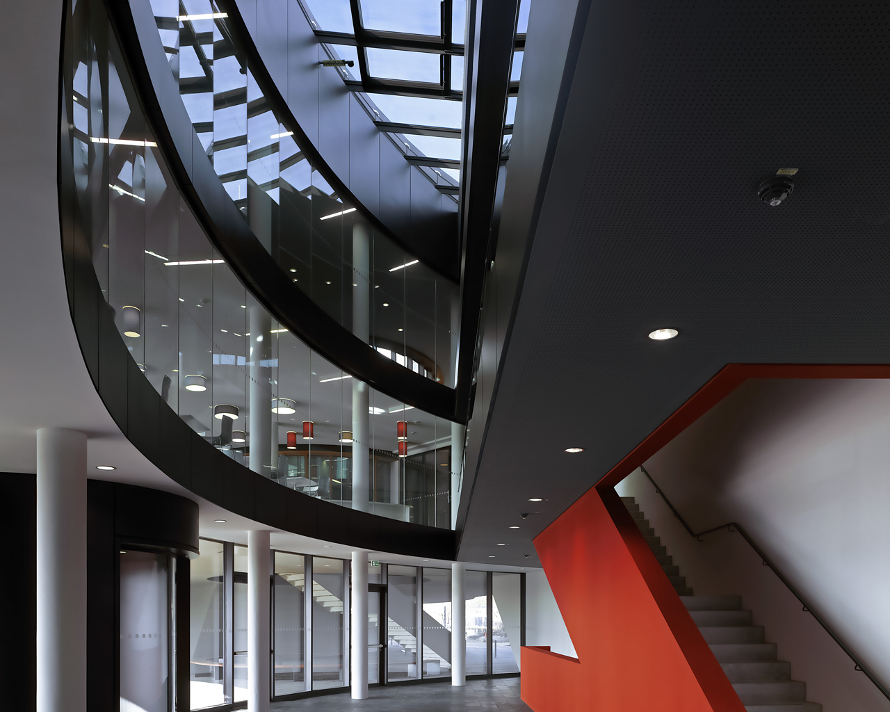 This image shows the central staircase of the new office Building at the ESO Headquarters in Garching, Germany. Whereas the rest of the building is kept in black and white, the staircase strikes with its bright red colour. This colour should resemble the colour of the Atacama Desert in Chile, which is home to the ESO Observatories.