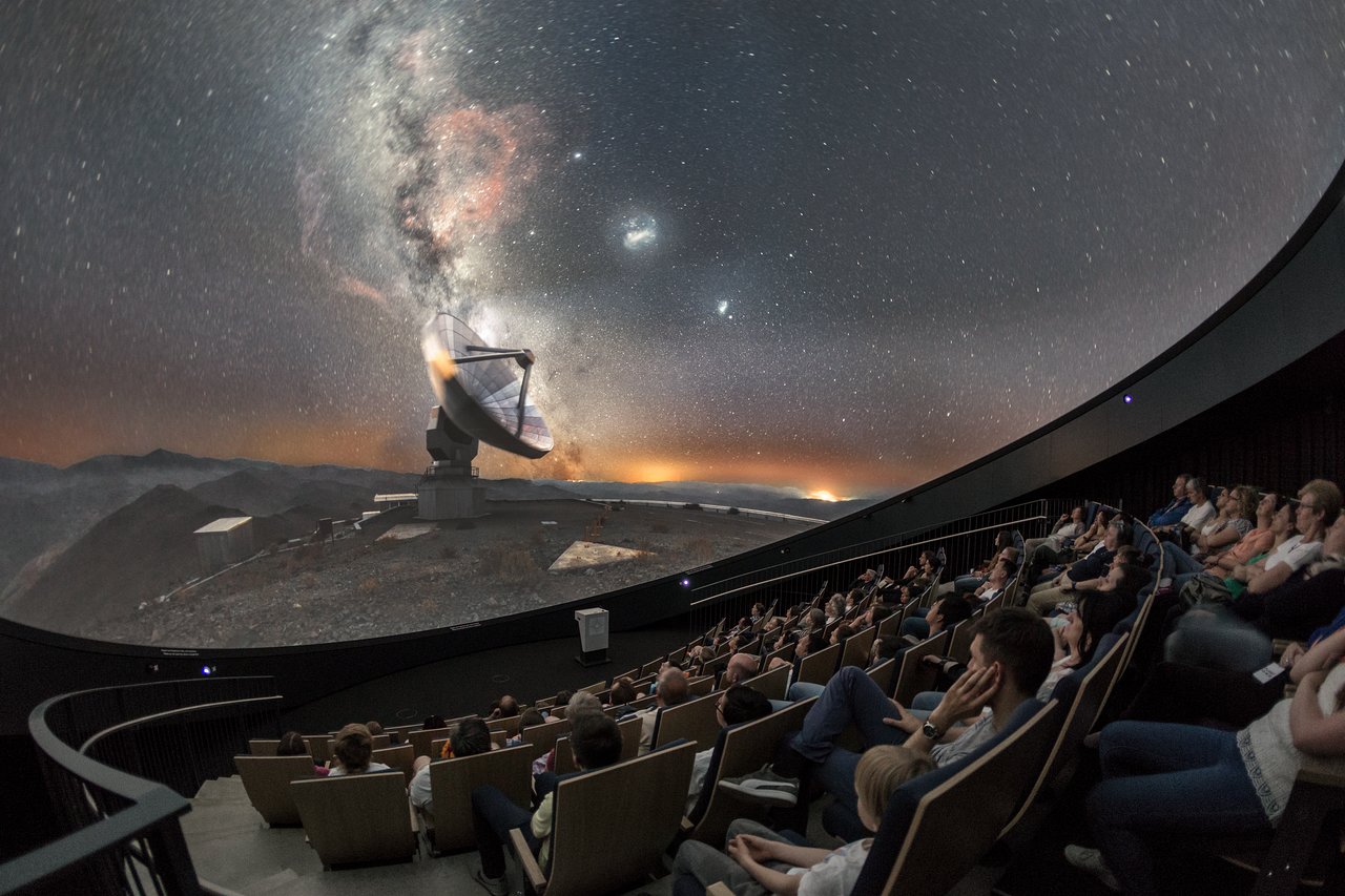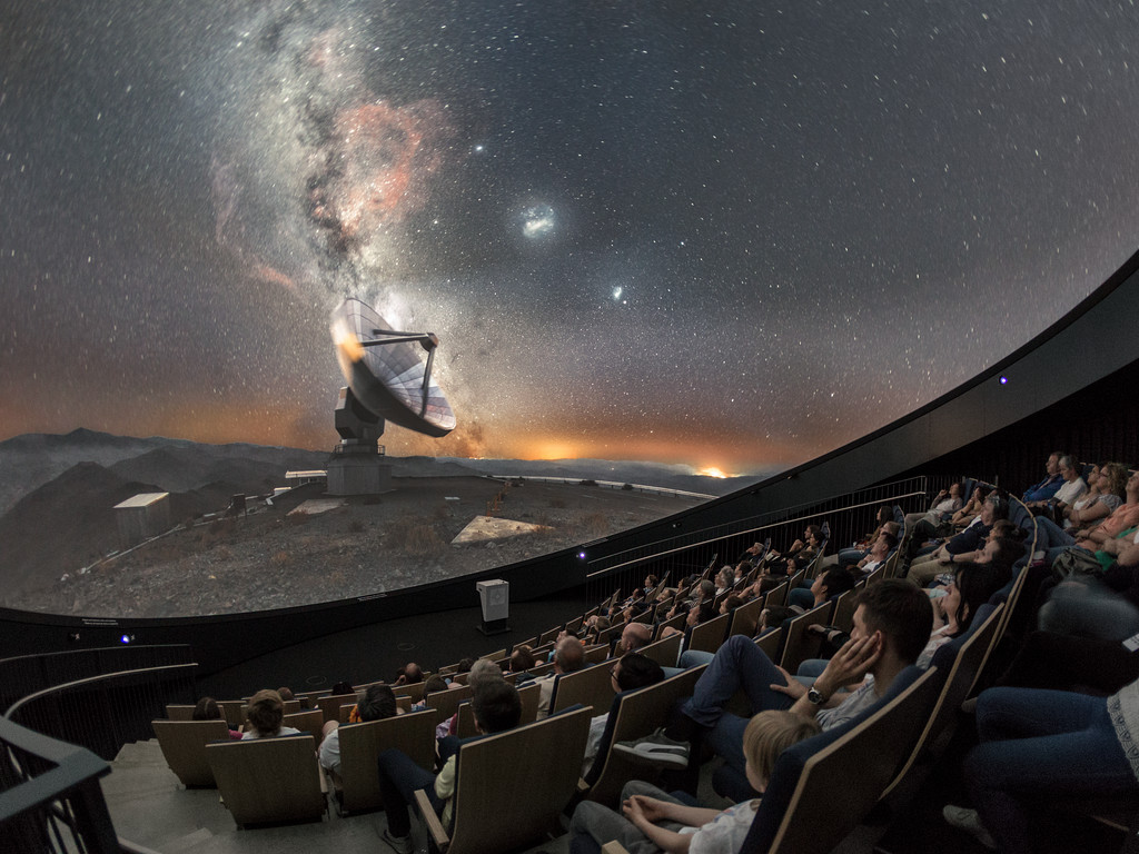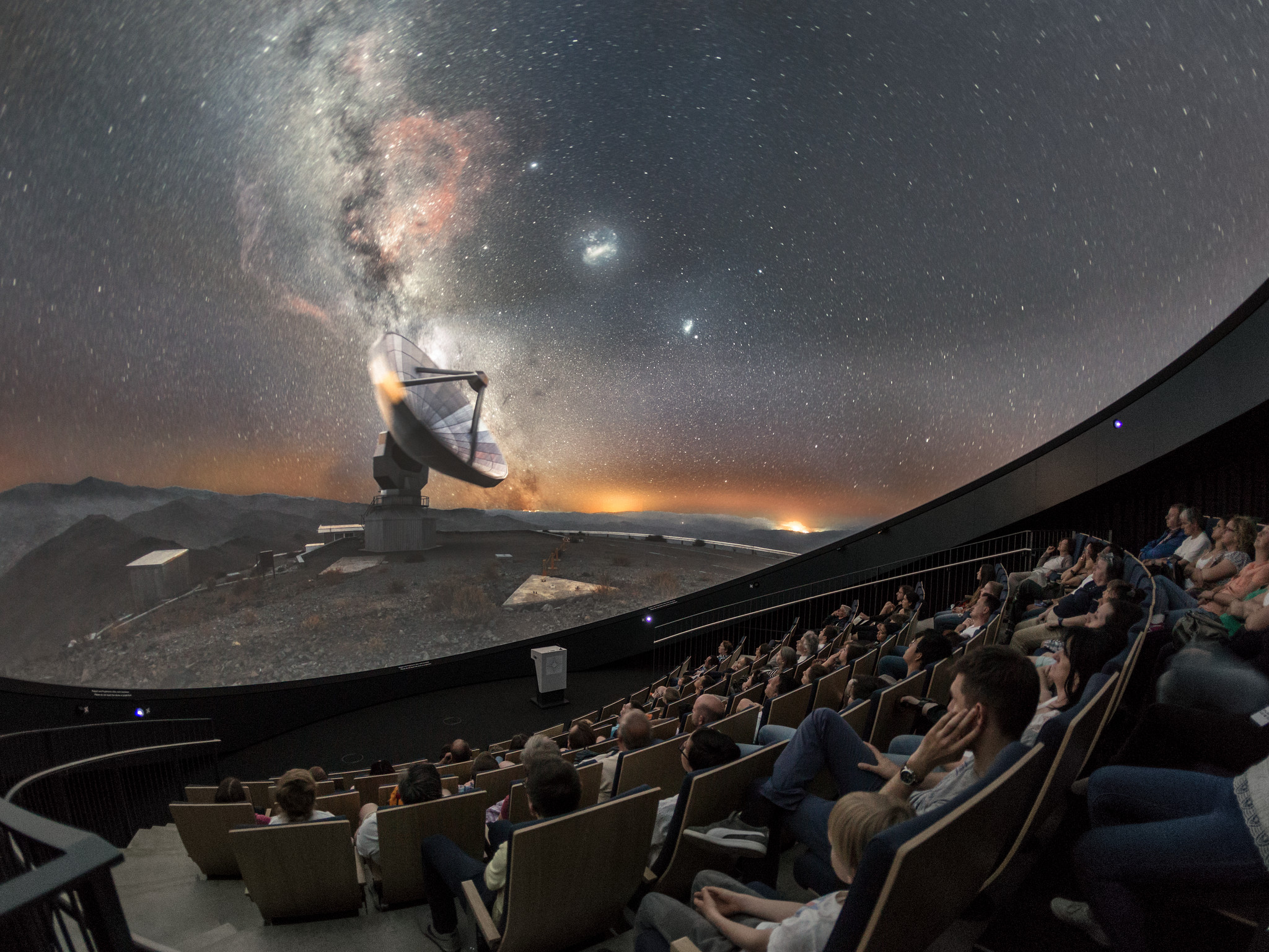 A view from inside the planetarium at the ESO Supernova Planetarium & Visitor Centre, which opened its doors to the public on Saturday 28 April 2018. The building is open five days a week and features planetarium screenings, tours and a permanent exhibition in both German and English. The 25-degree tilted planetarium dome does not just give the audience the sensation of watching the Universe, but of being immersed in it. In this image the audience are shown the decommissioned Swedish–ESO Submillimetre Telescope.