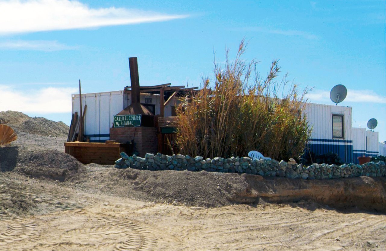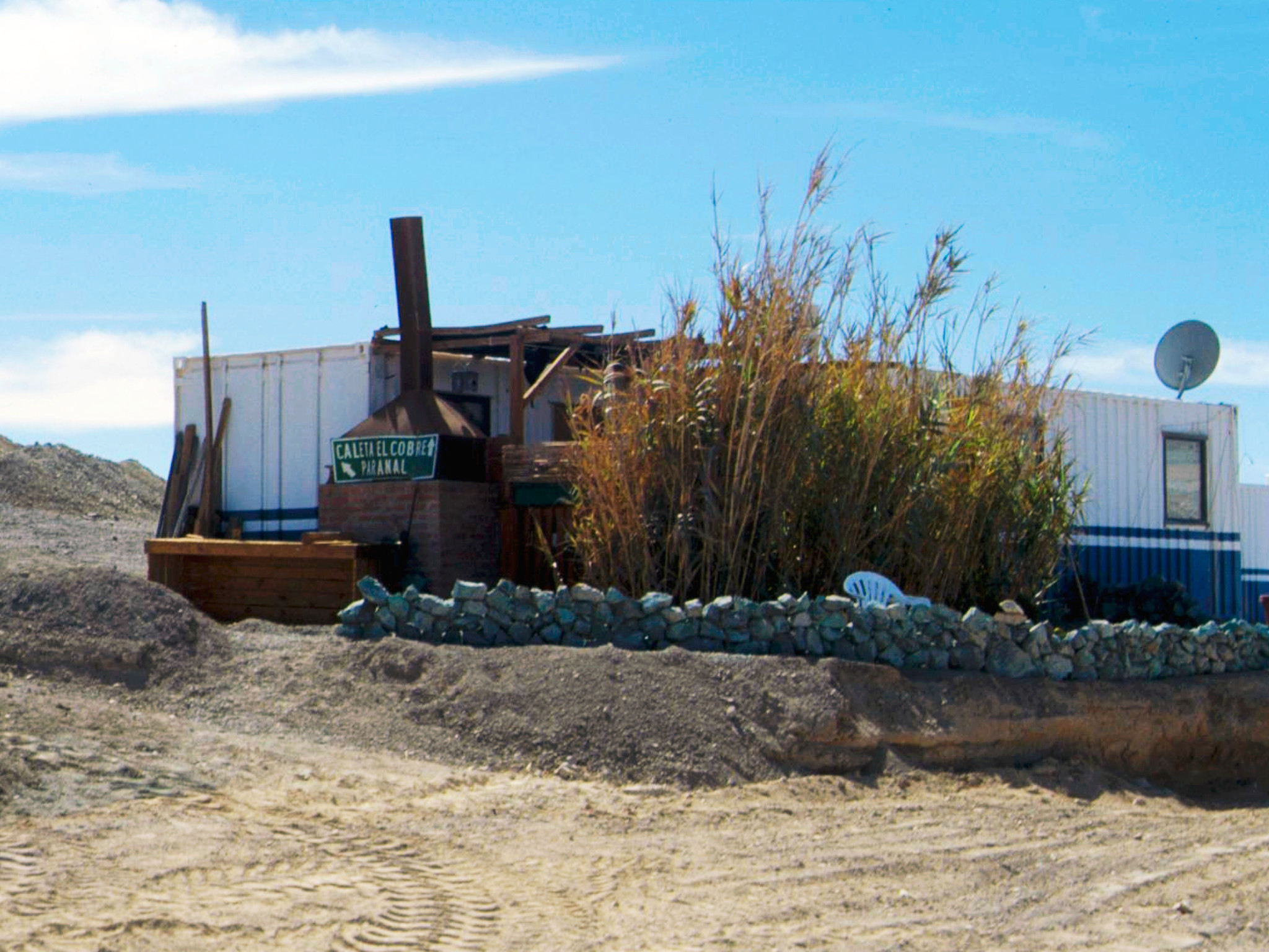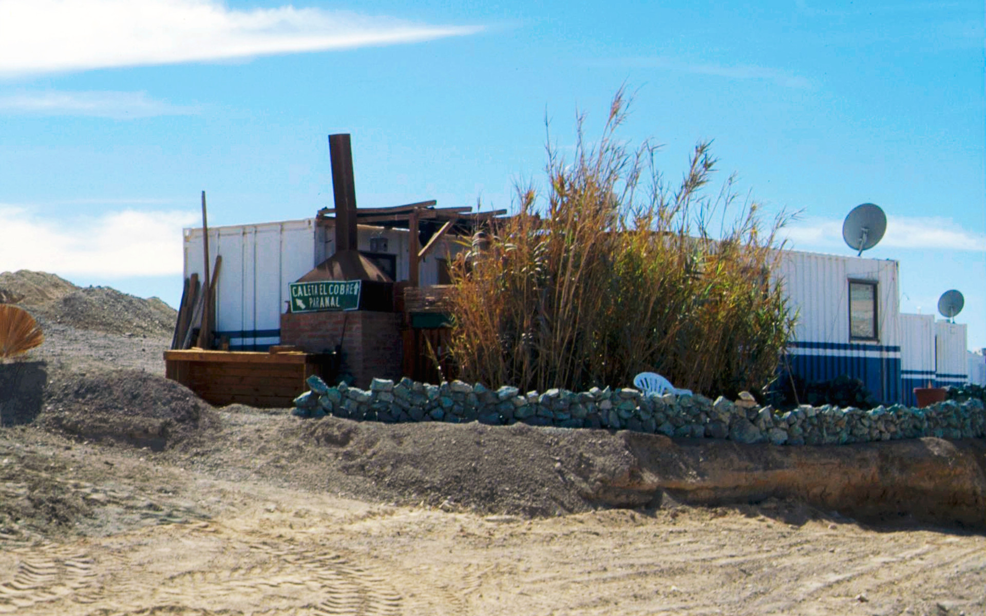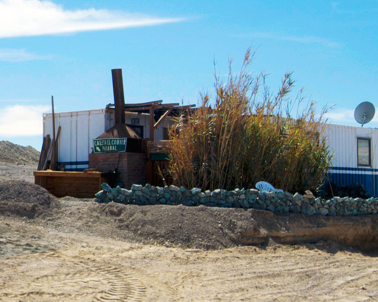 The owner of this very special container spent a lot of effort to make himself a nice home, in the desert. A barbecue grill was added, as well as the plants visible in the foreground. To water the plants, shower water has to be used. Additional flower beds and boxes were used later to add even more green to the surroundings of the container and a stone wall with copper ore rocks from the abandoned mine on the way to Paranal was constructed to surround the little garden.