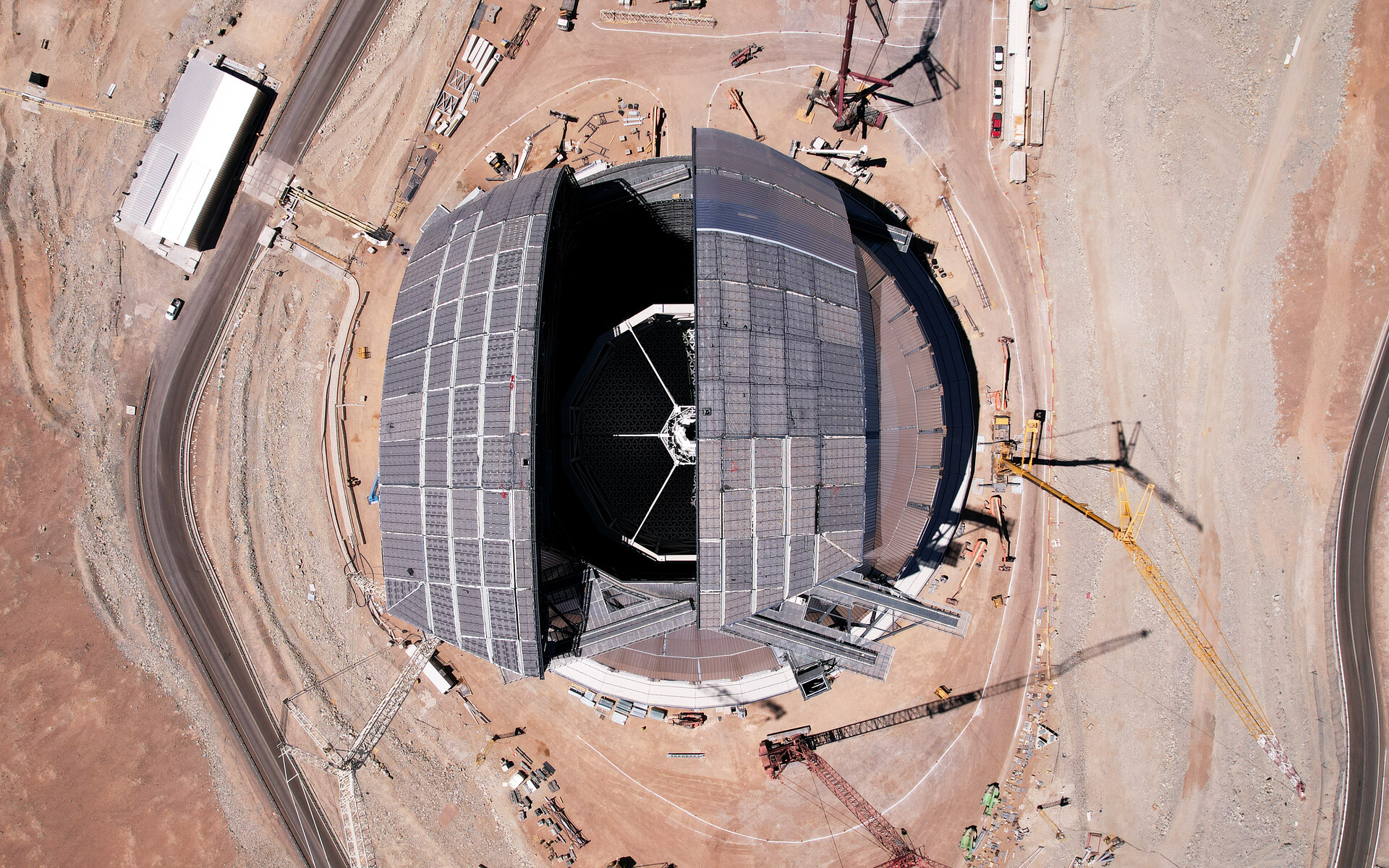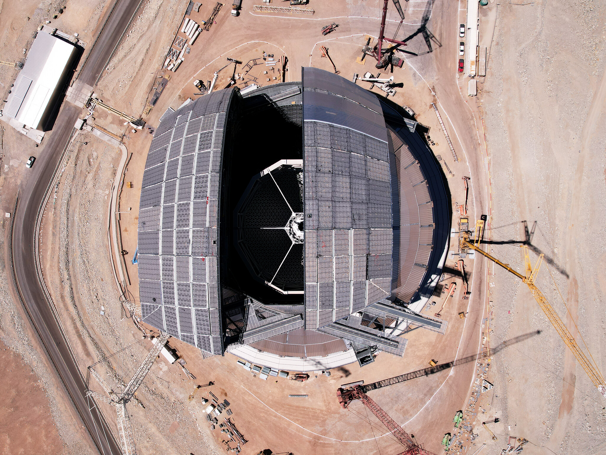 This aerial view of ESO's Extremely Large Telescope (ELT) was taken during a test of the operation of the doors, which will provide a 41 metre aperture when fully open. With each door weighing approximately 600 tonnes once completed, engineering the “eyelids” of the world’s biggest eye to the sky is no easy feat. Structural integrity under repeated motion and the ability to protect the interior from extreme environmental conditions will be achieved with features such as multiple rails and inflatable seals. This image also shows a glimpse of the spider-like structure at the top of the ELT, which will hold at its centre the telescope's secondary mirror — part of a five-mirror system that will deliver better image quality over a larger field of view.