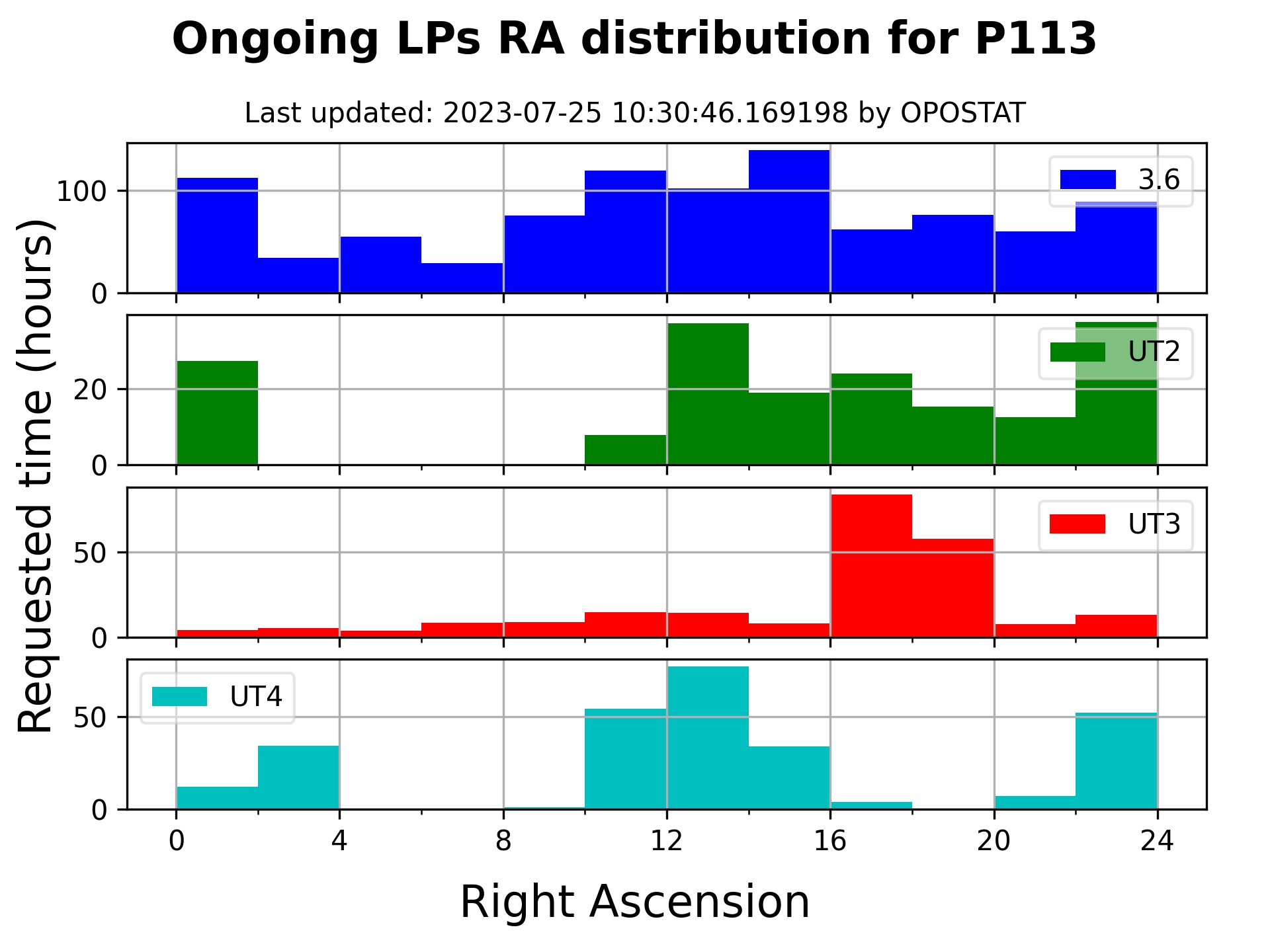 On the other hand, the opposite is true for August (RA~20:30) and January (RA~08:30); the time request for targets in the corresponding RA ranges tends to be relatively low, allowing a significantly higher fraction of runs applying for time at this RA to be scheduled (if considered useful by the OPC).