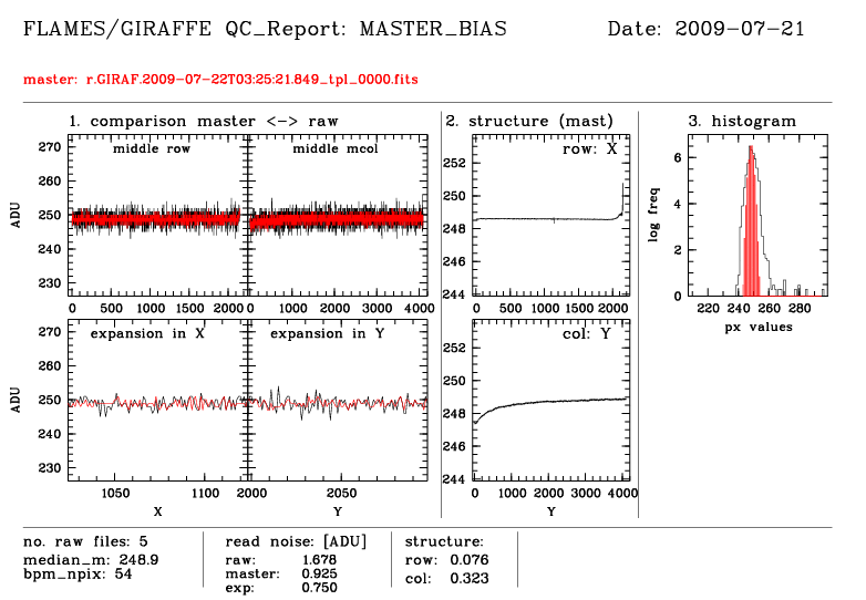 bottom panel: some QC1 parameters (median_master; raw RON, master RON, expected RON=raw/sqrt(5), structure parameters)